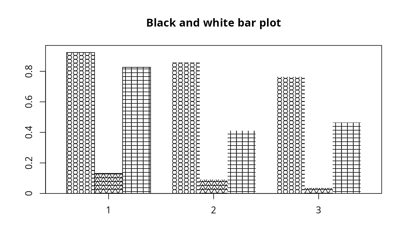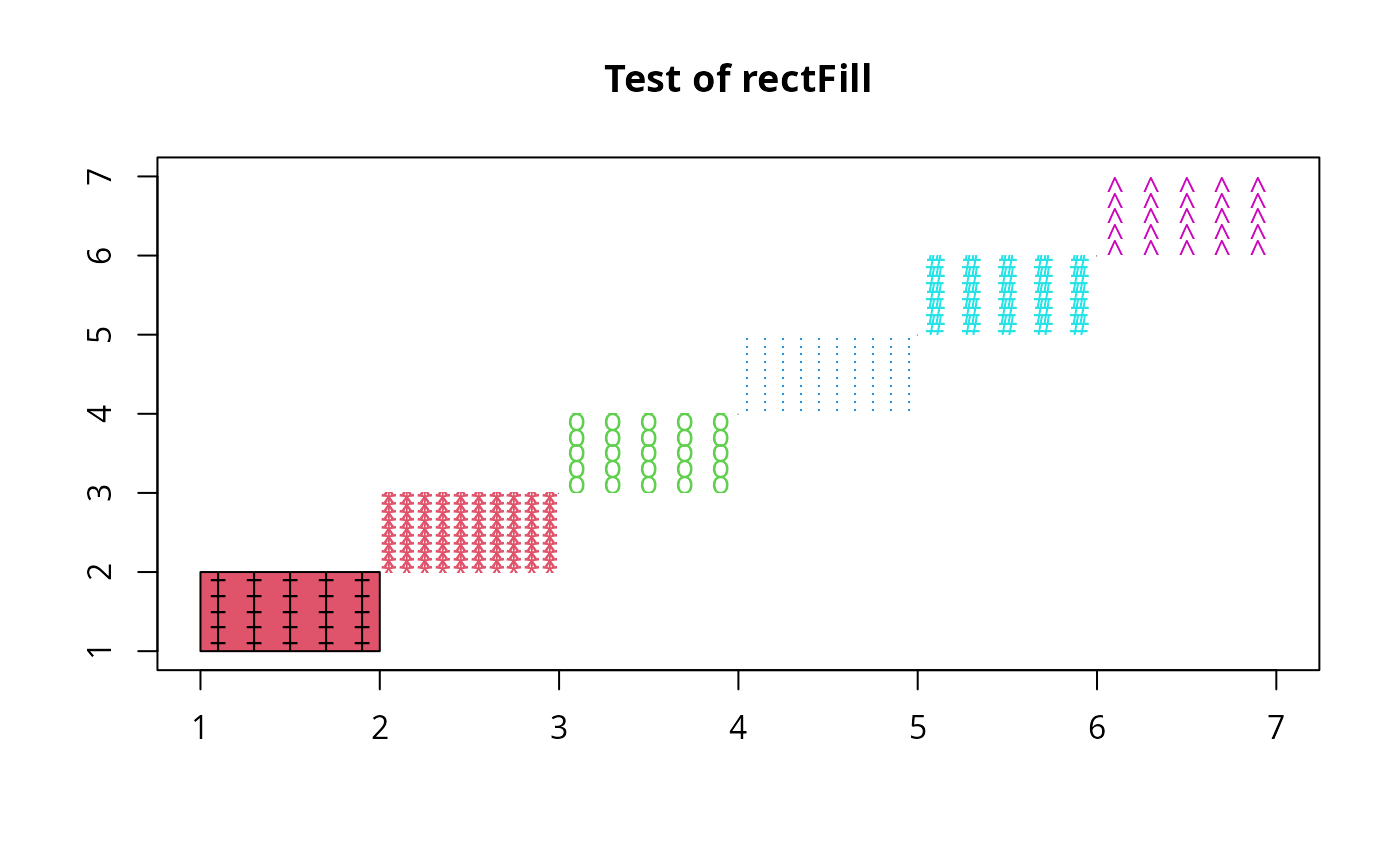 plot(1:7,type="n",xlab="",ylab="",main="Test of rectFill")rectFill(1:6,1:6,2:7,2:7,bg=2:7,pch=c("+","*","o",".","#","^"), xinc=c(0.2,0.1,0.2,0.1,0.2,0.2),yinc=c(0.2,0.1,0.2,0.1,0.2,0.2), pch.col=1:6)barp(matrix(runif(9),nrow=3),main="Black and white bar plot",pch=1:3)
