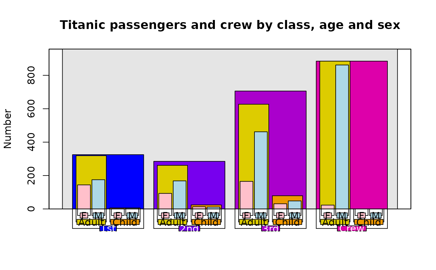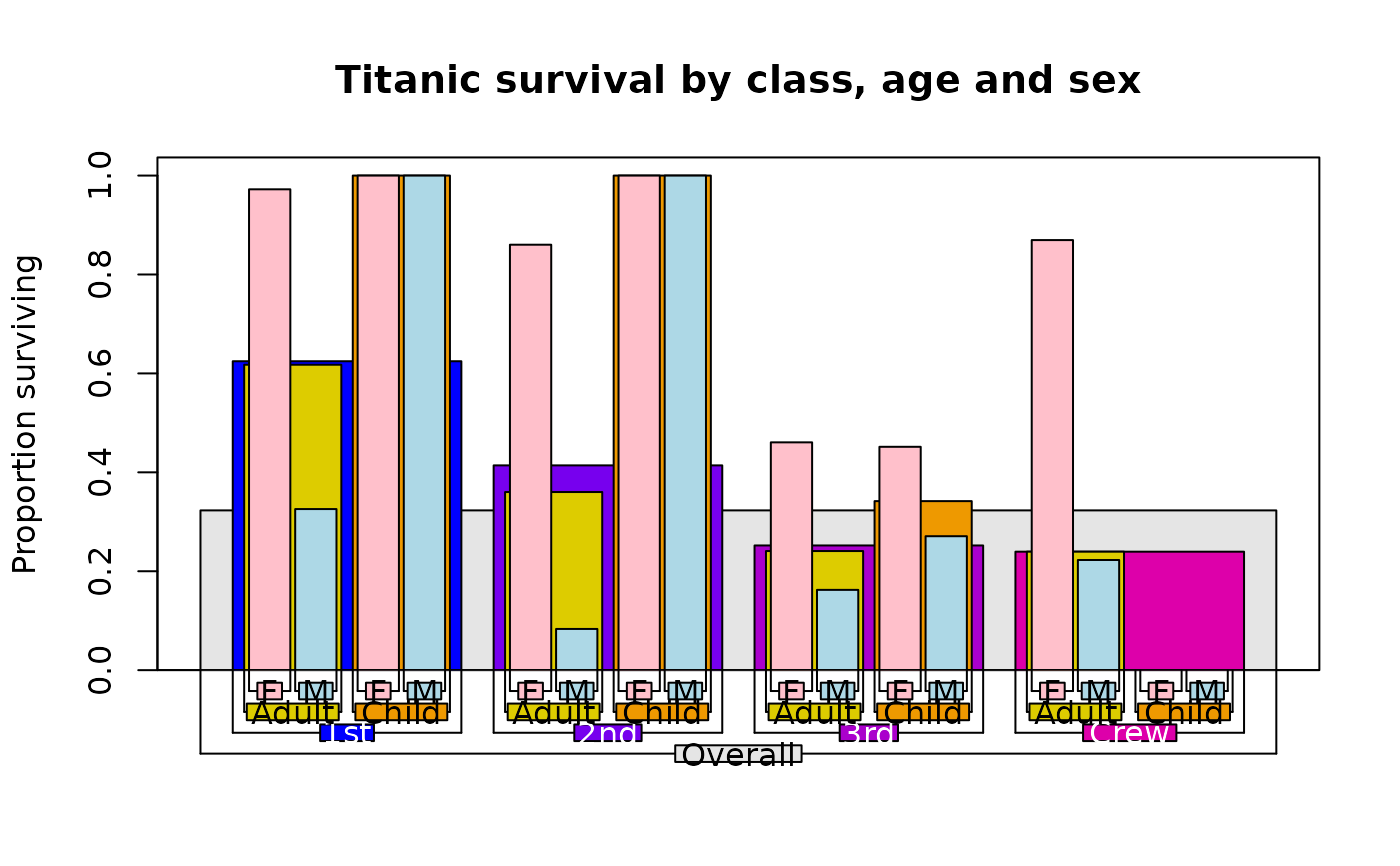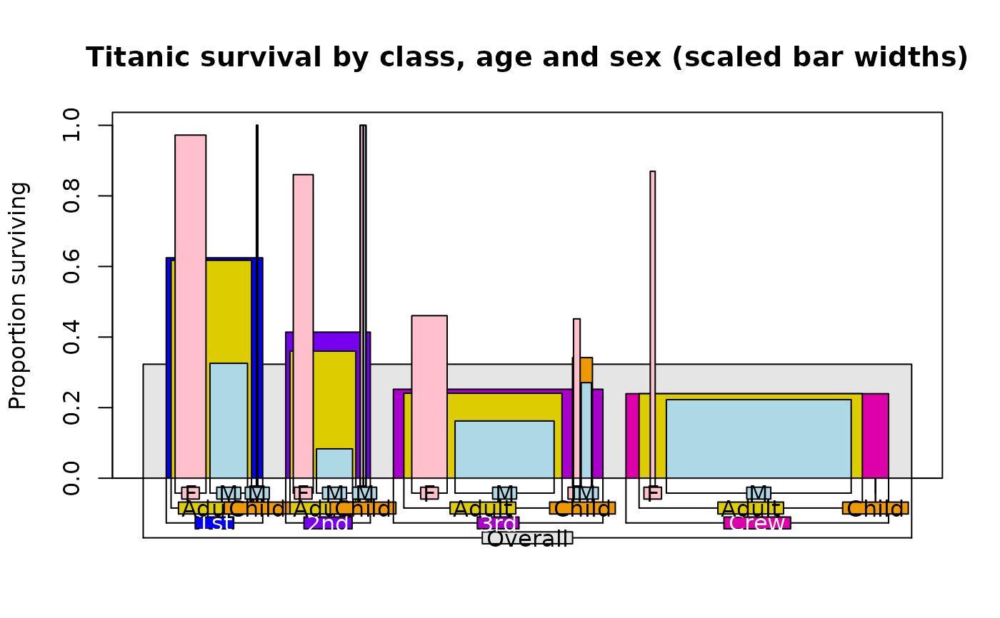 main="Titanic survival by class, age and sex (scaled bar widths)",
