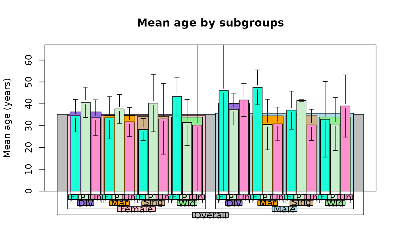 main="Mean age by subgroups",errbars=TRUE,col=test.col)