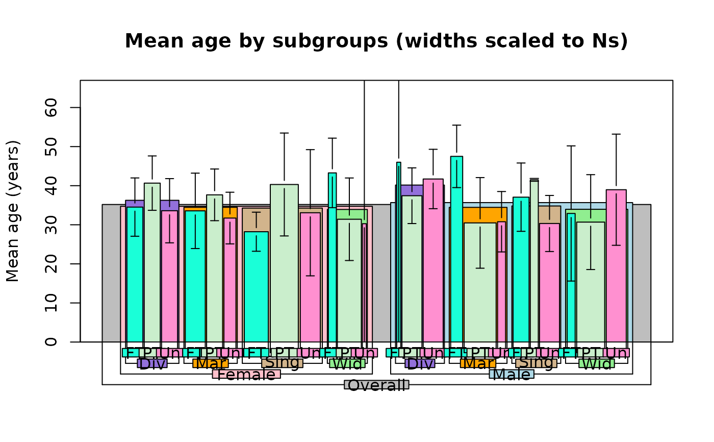 main="Mean age by subgroups (widths scaled to Ns)",errbars=TRUE,col=test.col,