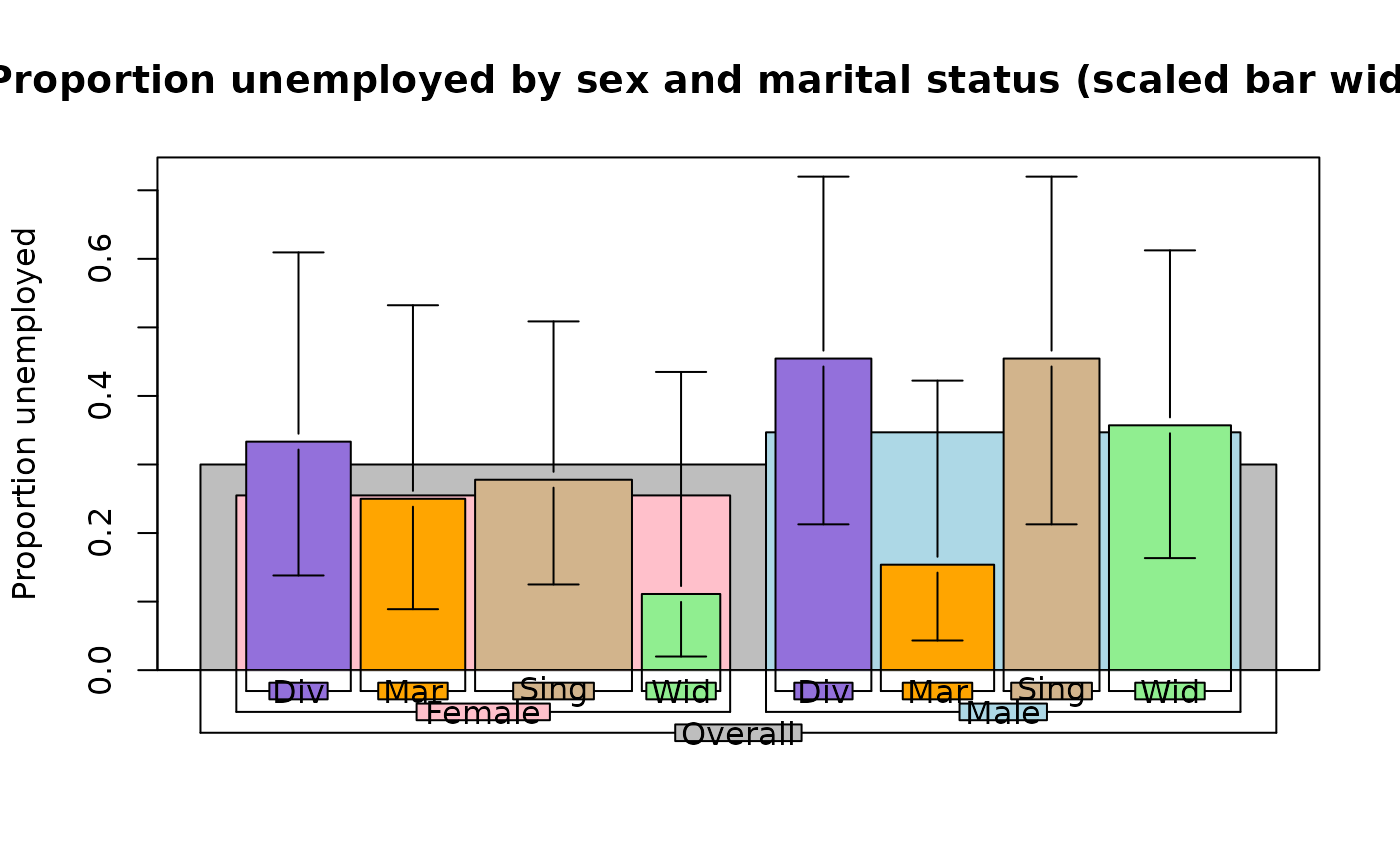 main="Proportion unemployed by sex and marital status (scaled bar widths)",