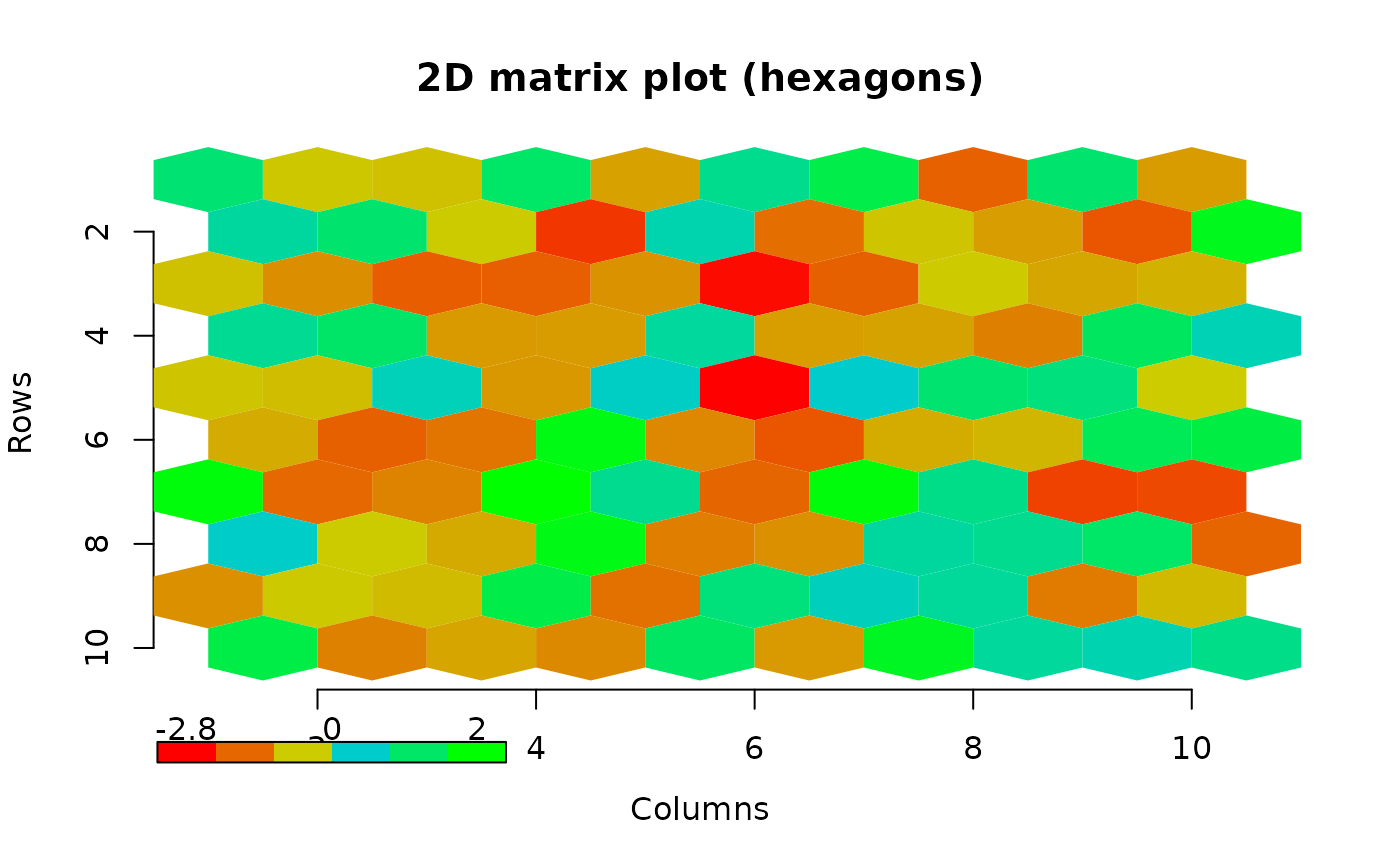 do.hex=TRUE,main="2D matrix plot (hexagons)",border=NA)