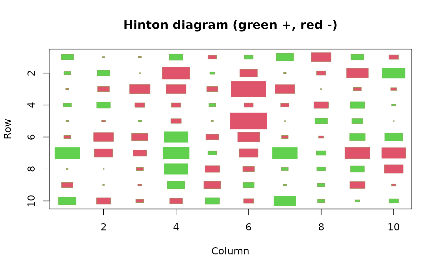 color2D.matplot(x,extremes=c(2,3),main="Hinton diagram (green +, red -)",