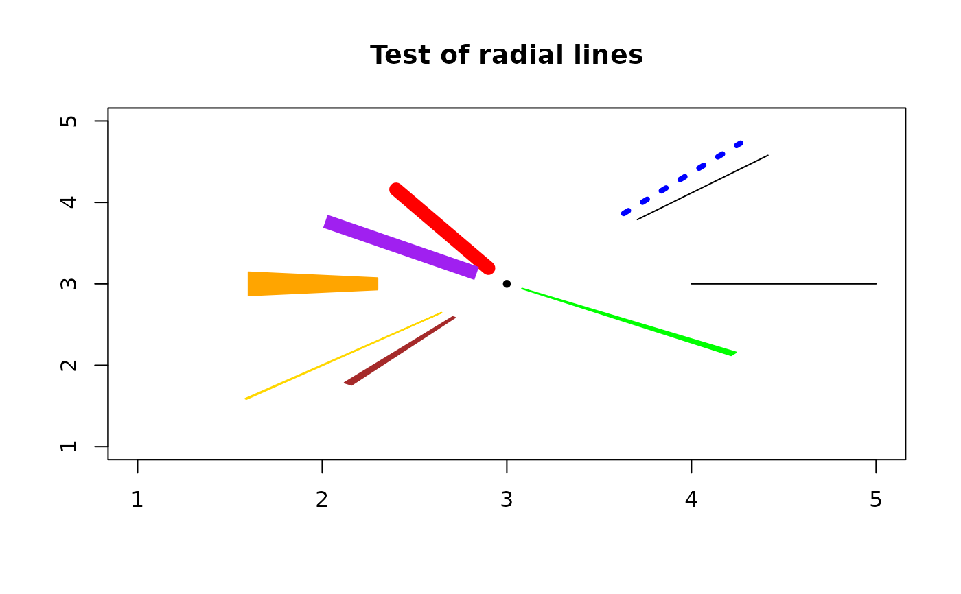 plot(0, xlim=c(1,5), ylim=c(1,5), main="Test of radial lines", xlab="", ylab="", type="n")