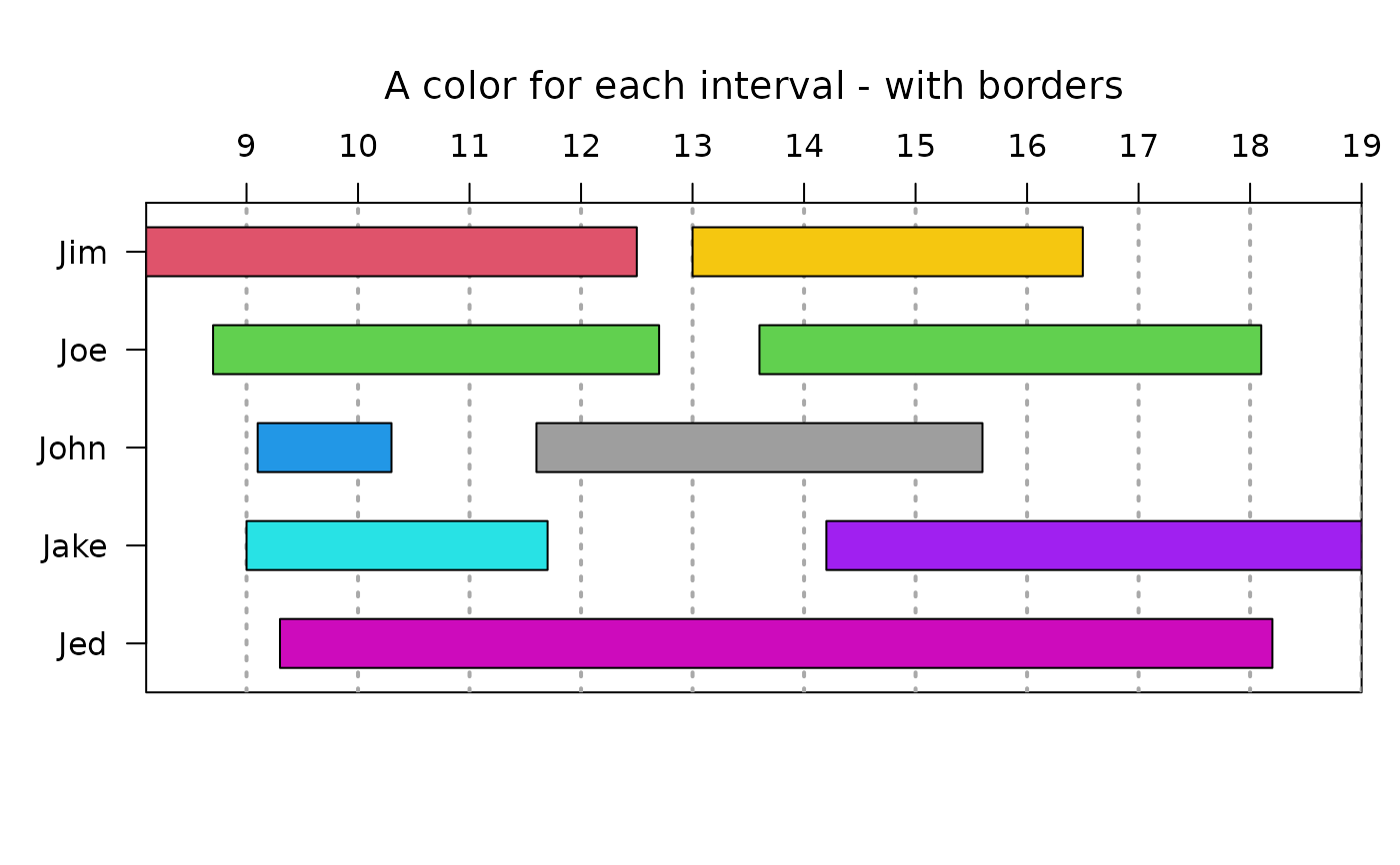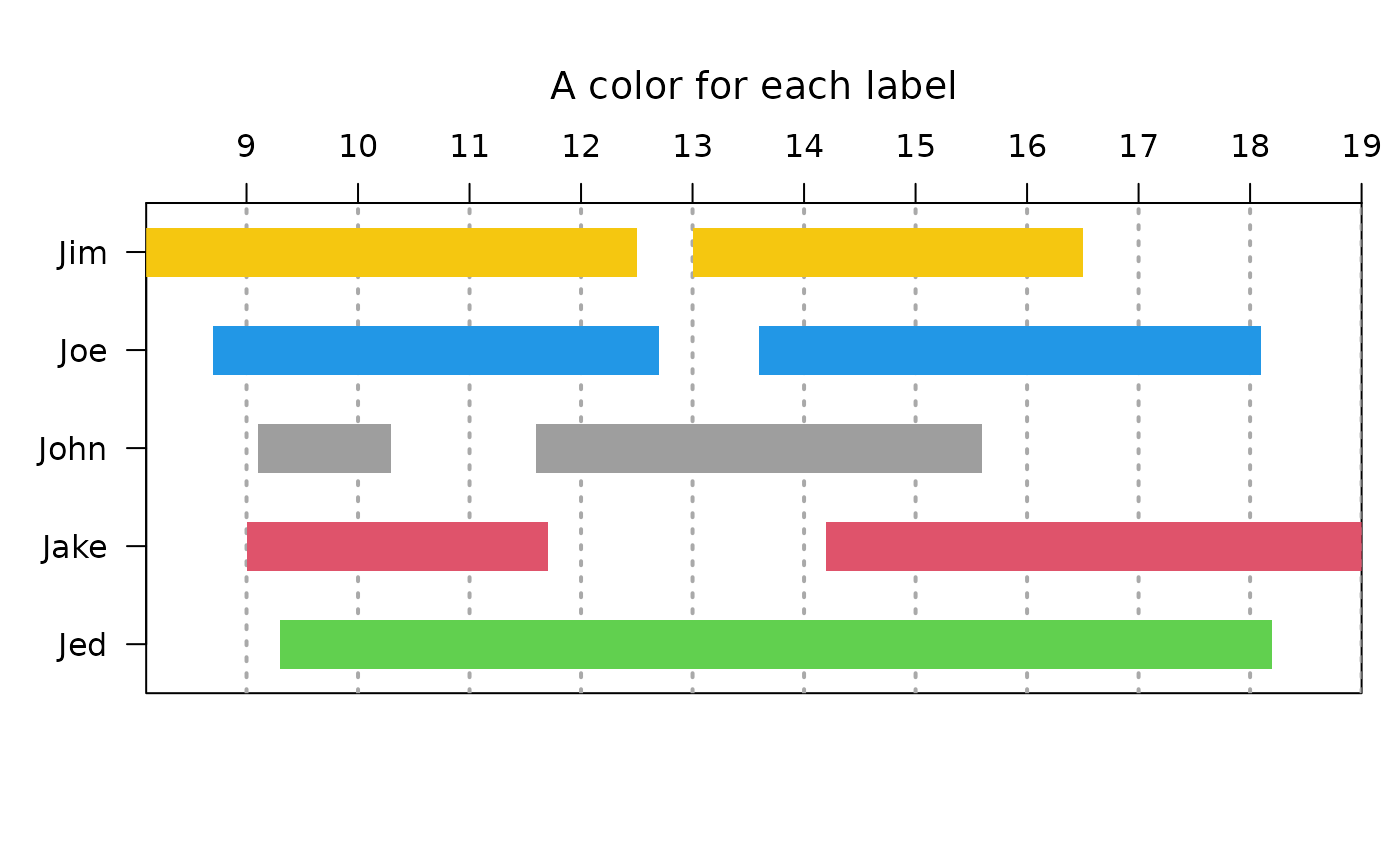 There can now be more than one time interval for each task. If there is, more than one bar will be displayed for each interval, which may not be a task at all, but rather intervals related to the labels. Colors can be specified for labels or intervals and if there are not as many colors as intervals, the first "number of unique labels" colors will be assigned to each unique label. This should make every bar for each label the same color, but be aware that the colors will be distributed in alphabetical order of the entity labels. If there are at least as many taskcolors as intervals, they will be assigned to intervals in the order of the taskcolors vector. The examples should make this clearer.