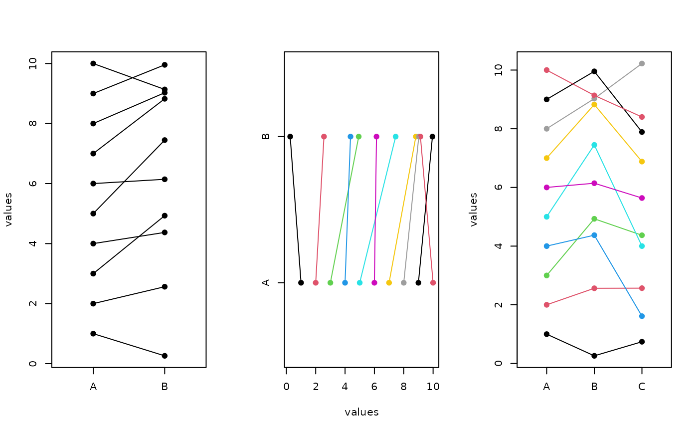 The function uses stripchart to plot 1-D scatter plots for each column in x. Then points are joined by lines for each rows of x.