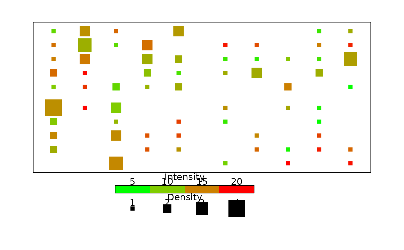 densityGrid(xyz,range.cex=c(1,4),xlim=c(1,10),ylim=c(1,10),