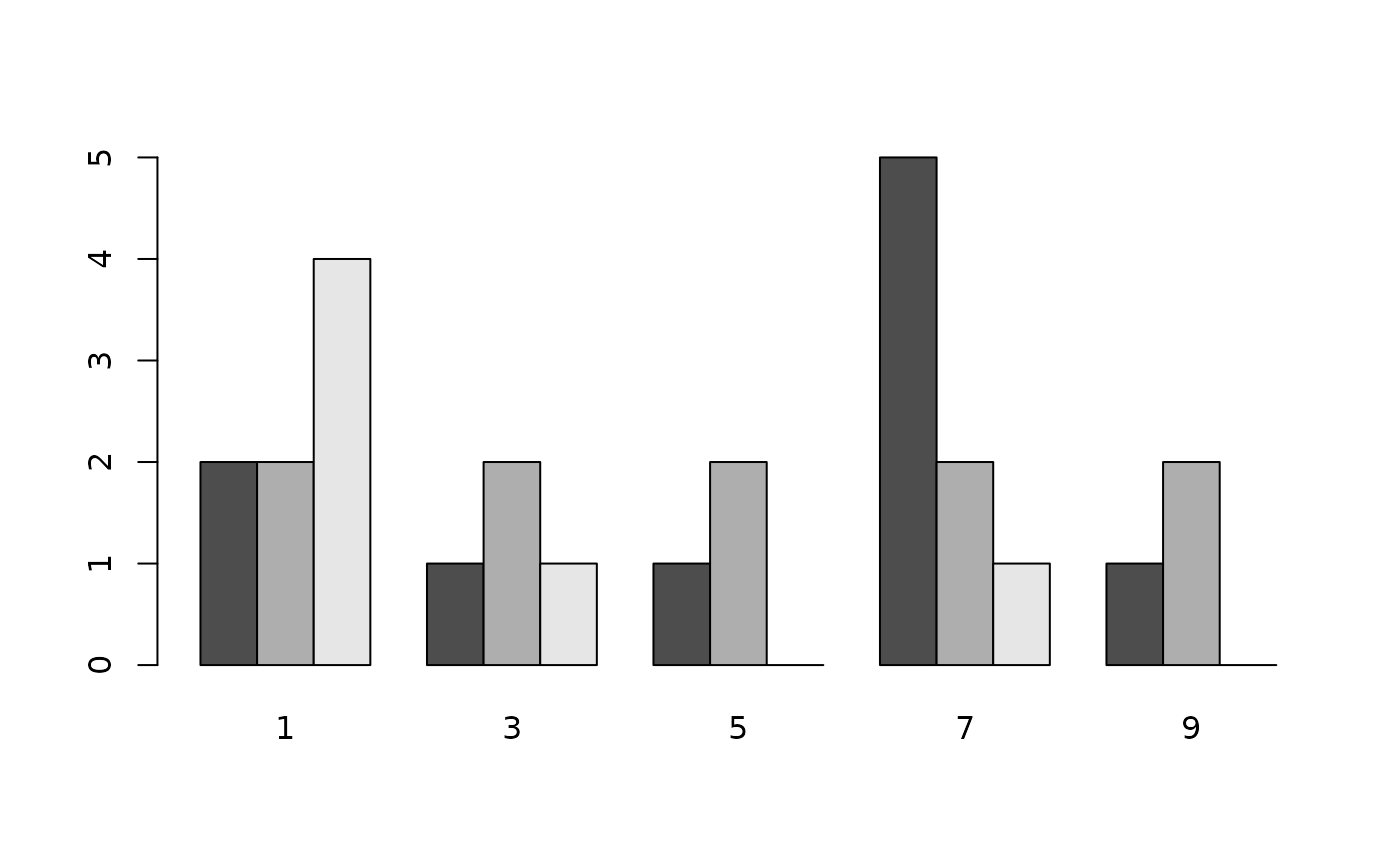 multhist.RdGiven a list, plots a side-by-side barplot containing the histograms of the elements