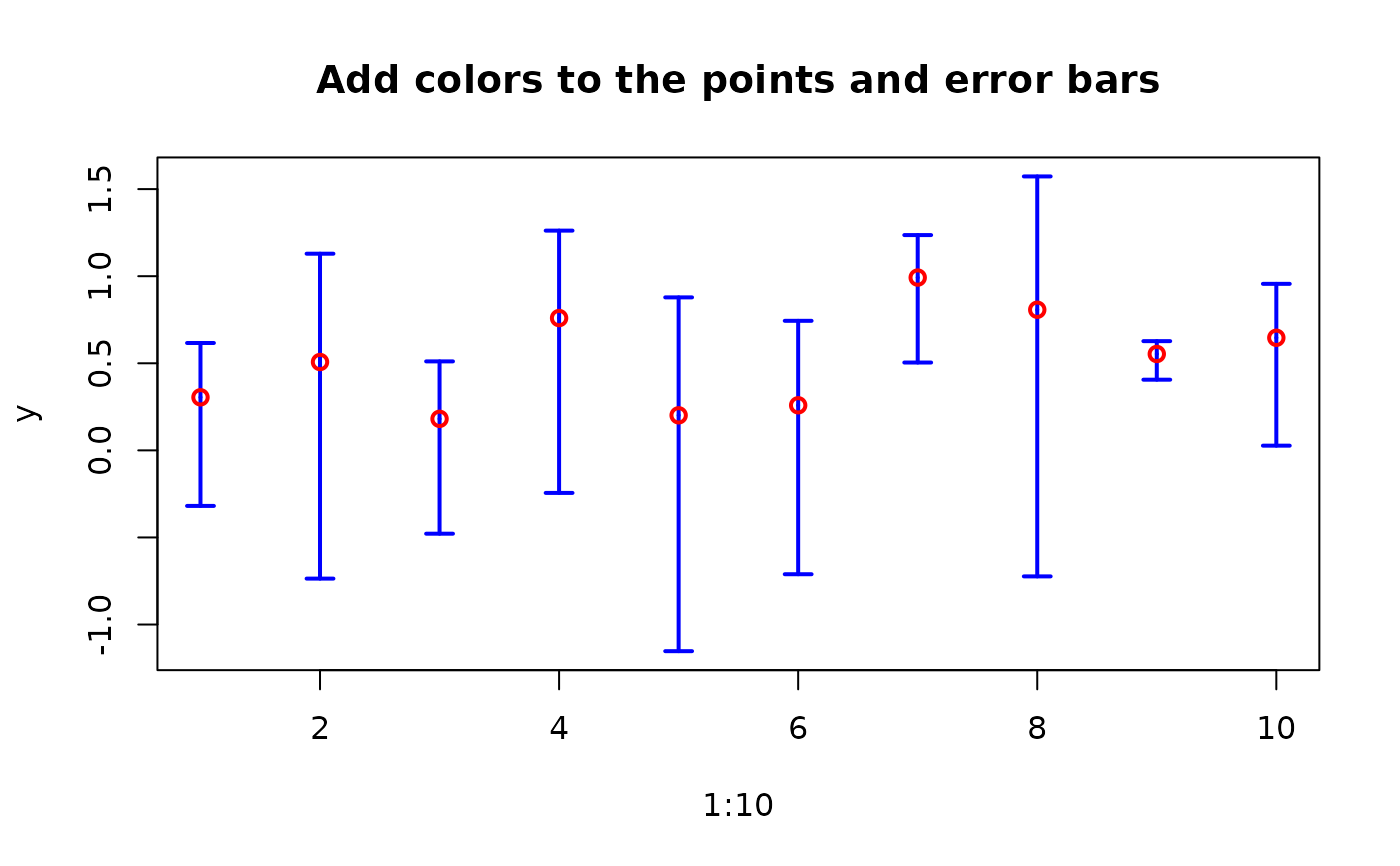plotCI(1:10,y,err,2*err,lwd=2,col="red",scol="blue",