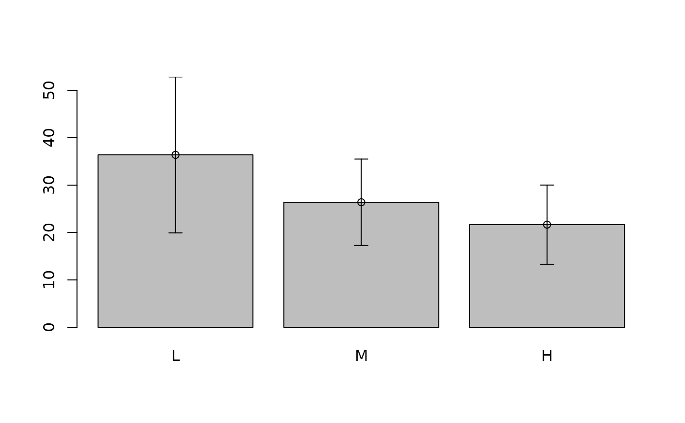 plotCI(barplot(wmeans,col="gray",ylim=c(0,max(wmeans+wsd))),wmeans,wsd,add=TRUE)