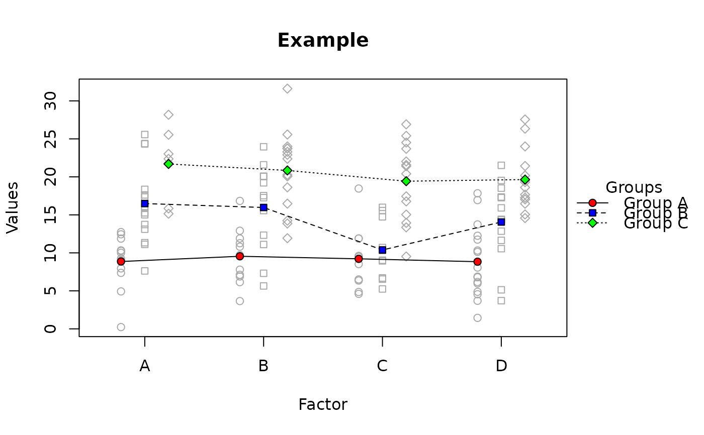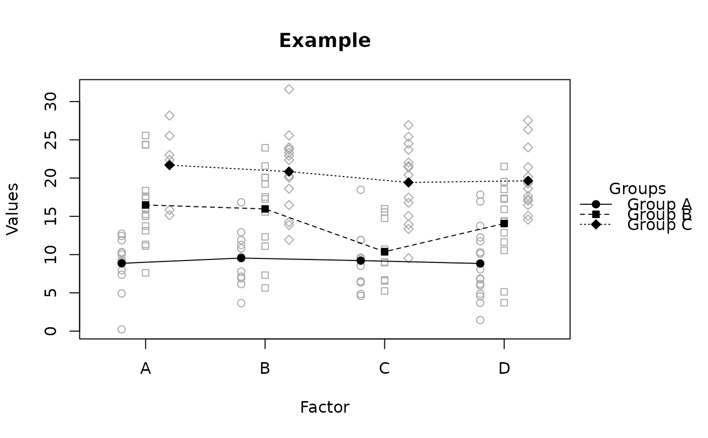 raw.means.plot(x, main = "Example", ylab = "Values", xlab = "Factor",