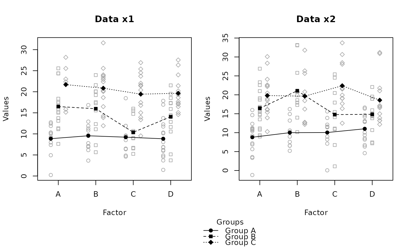 raw.means.plot(x2, main = "Data x2", ylab = "Values", xlab = "Factor",