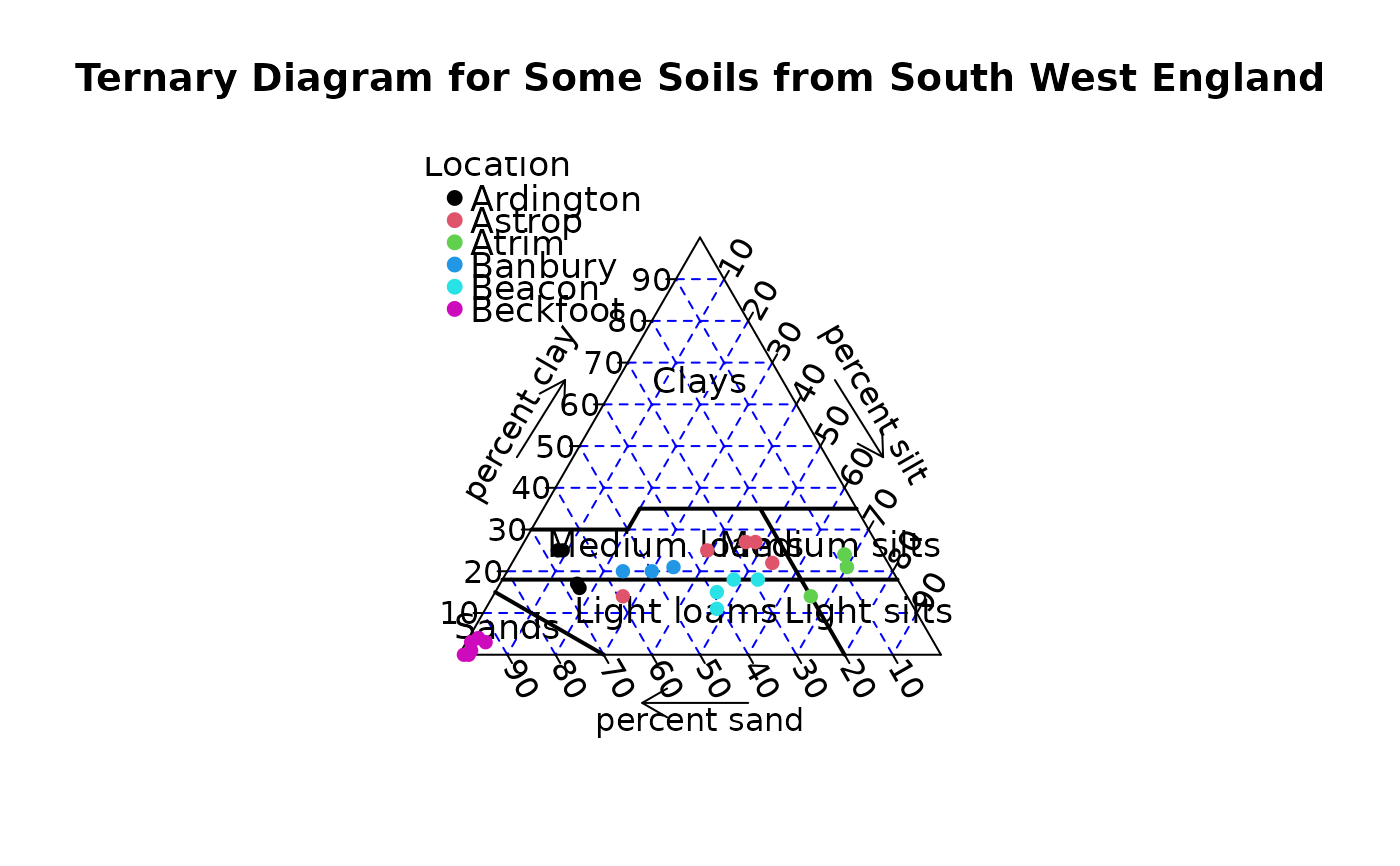main = "Ternary Diagram for Some Soils from South West England",