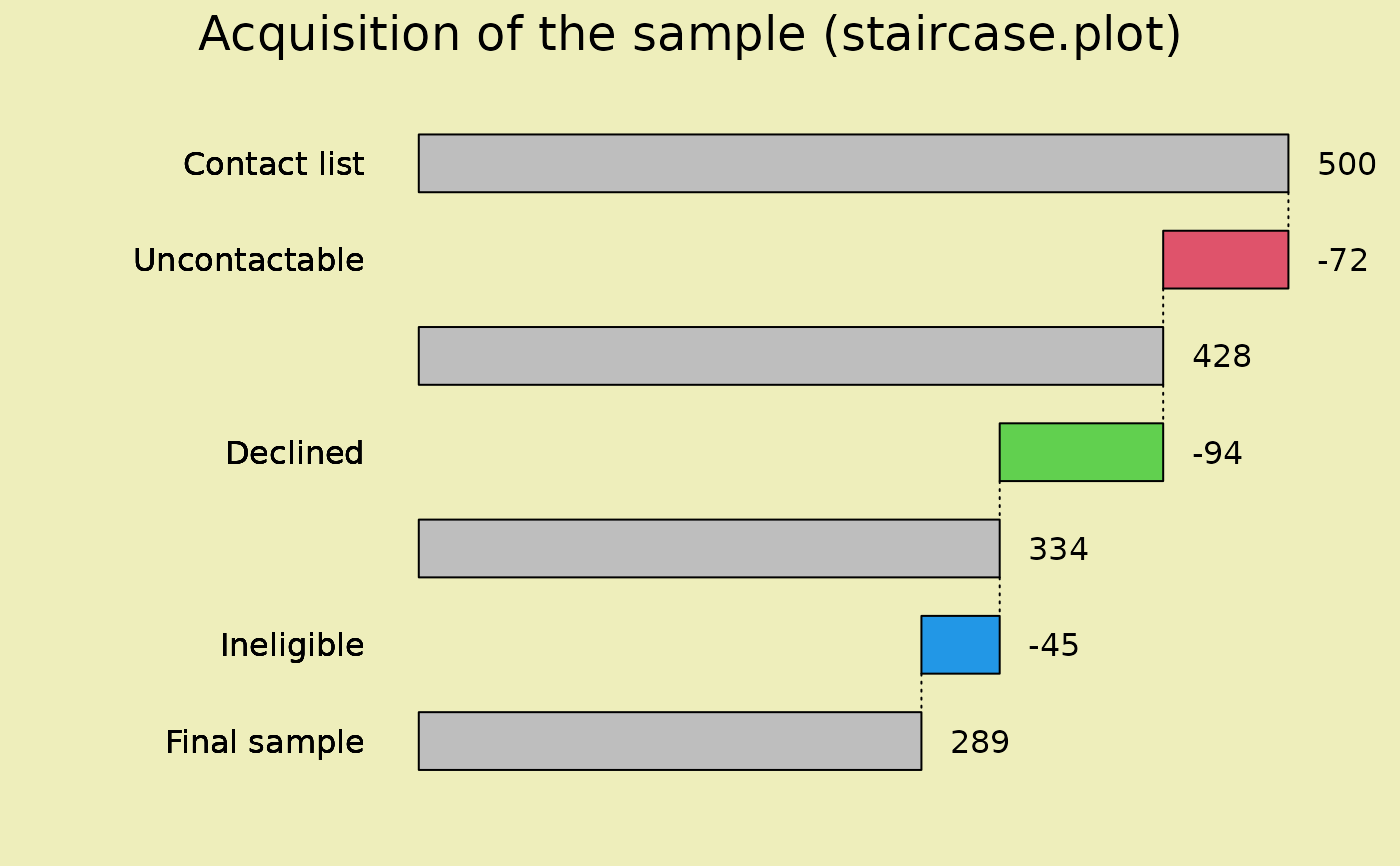 Displays a plot representing successive changes in counts or values. For example, if a research study attempts to contact a certain number of people and some cannot be contacted, some decline to participate, some are ineligible, the final sample will be smaller than the initial contact list. The first value will be the total of attempts, there will be a number of decrements, and the last value will be the actual sample. There may be intermediate totals specified. This produces a visual display of the sampling procedure. See the example.