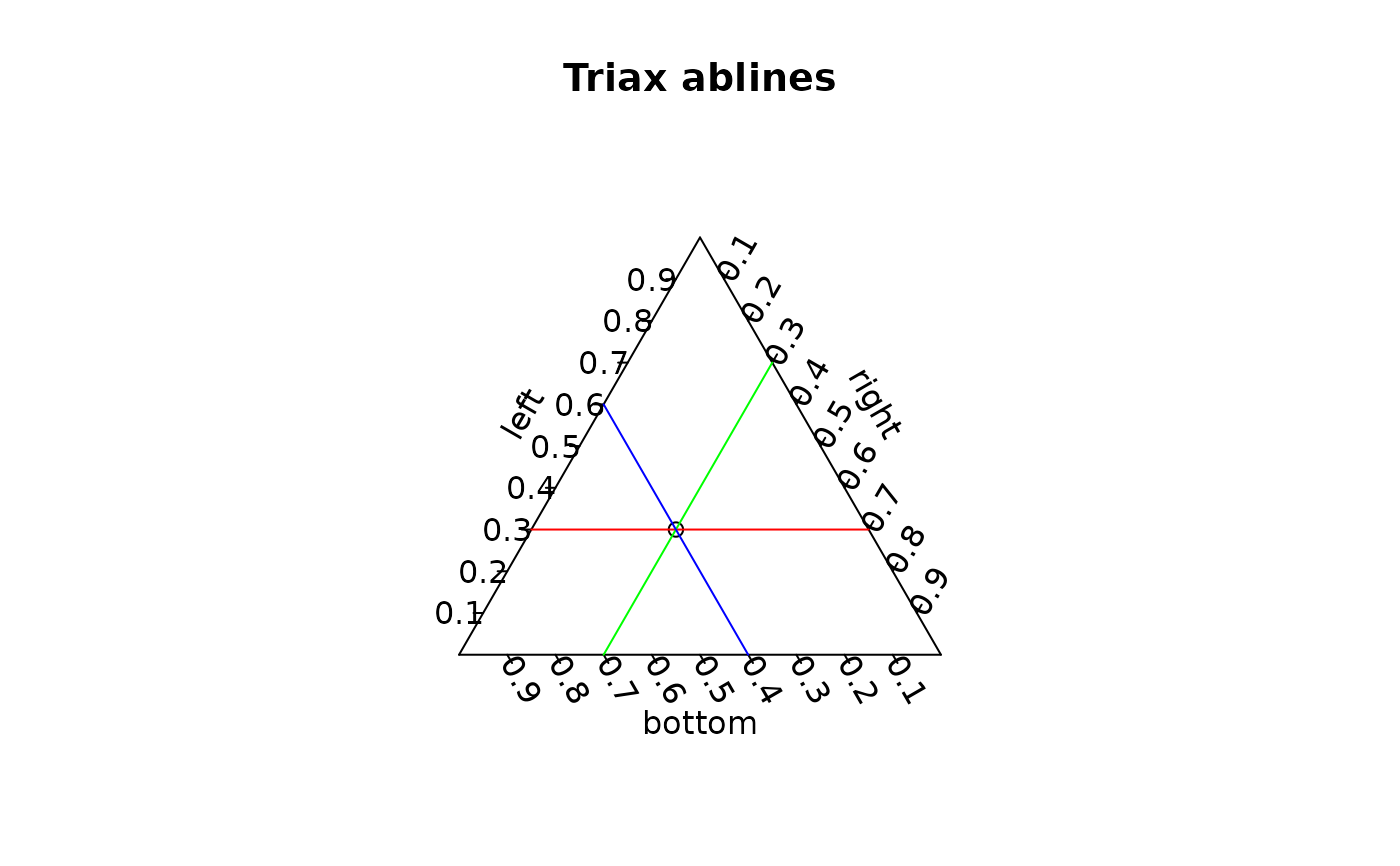 triax.abline displays one or more lines on a triangle plot. Lines are oriented in the conventional way, horizontal for the left axis, slanting up to the right for the right axis and up to the left for the bottom axis. If cc.axes is TRUE, the orientation is up-left for the left axis, horizontal for the right axis and up-right for the bottom axis.
