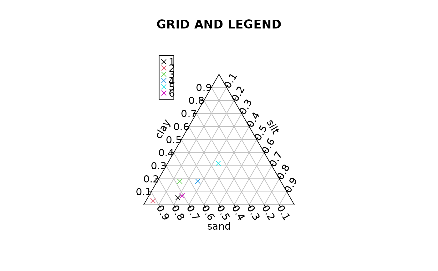 triax.return<-triax.plot(soils[1:6,],main="GRID AND LEGEND",
