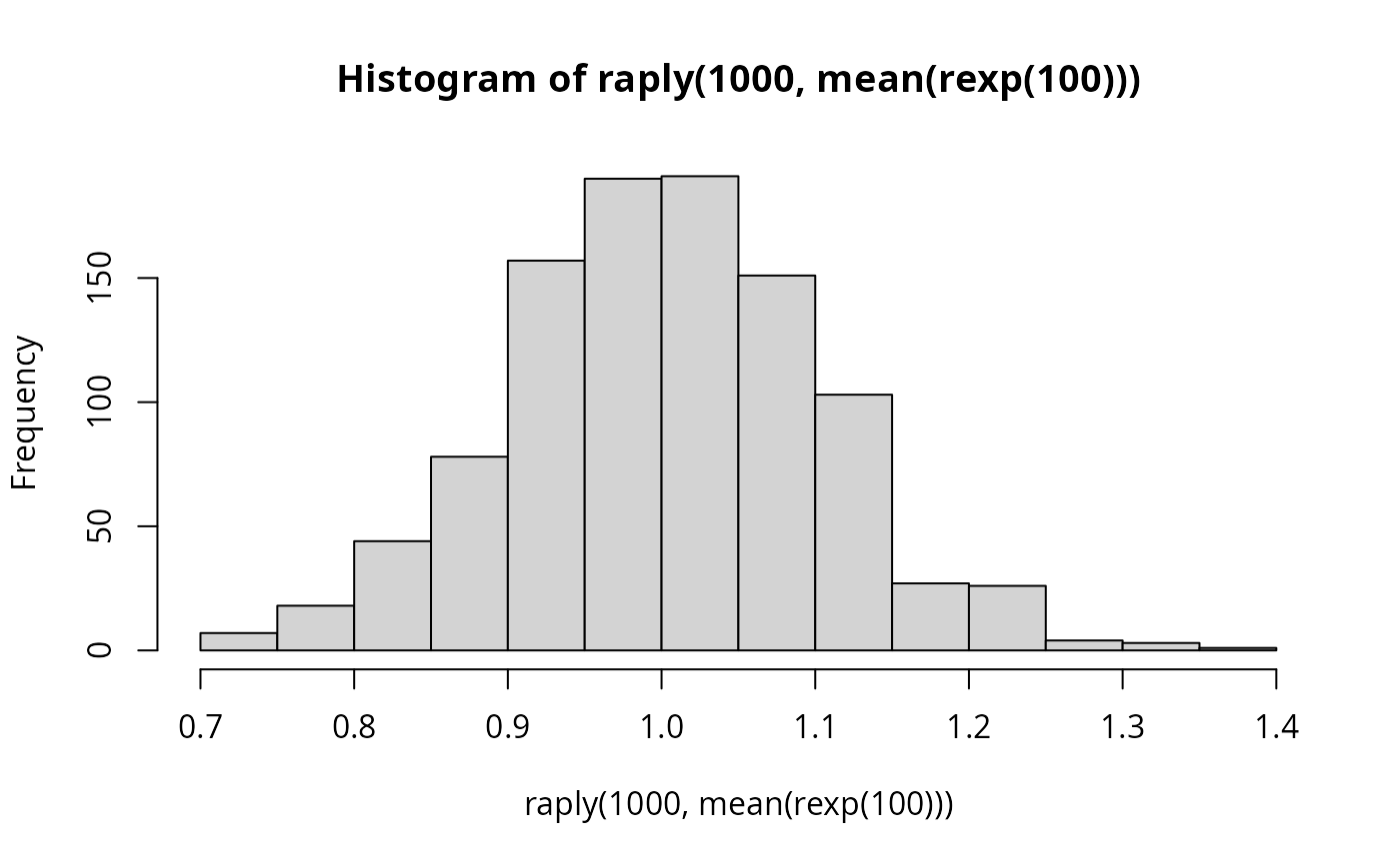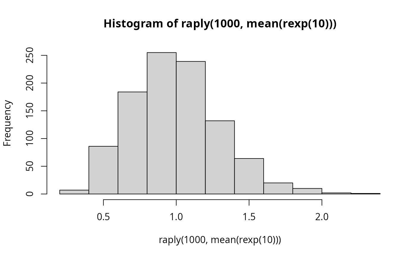 hist(raply(1000, mean(rexp(1000))))