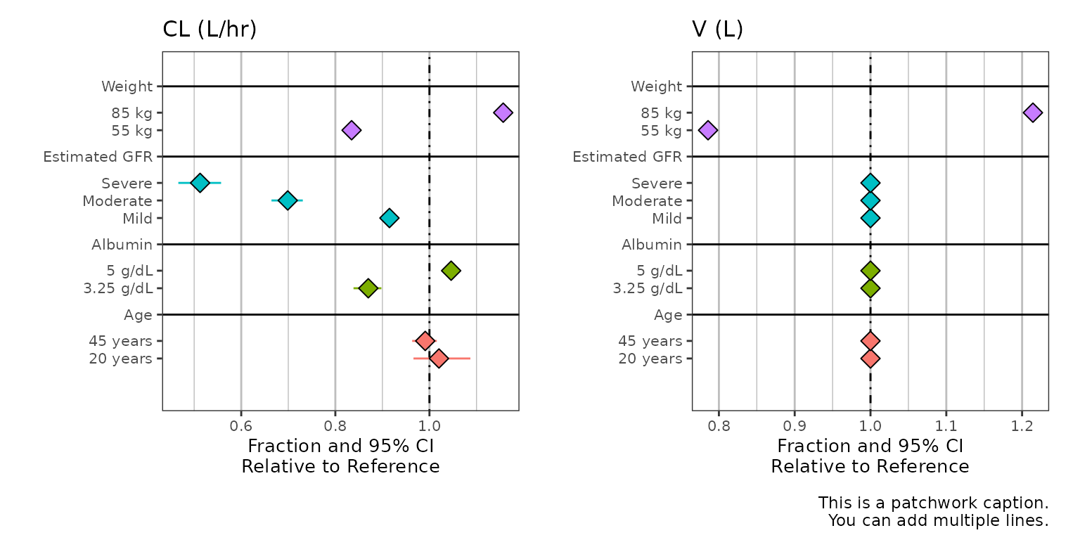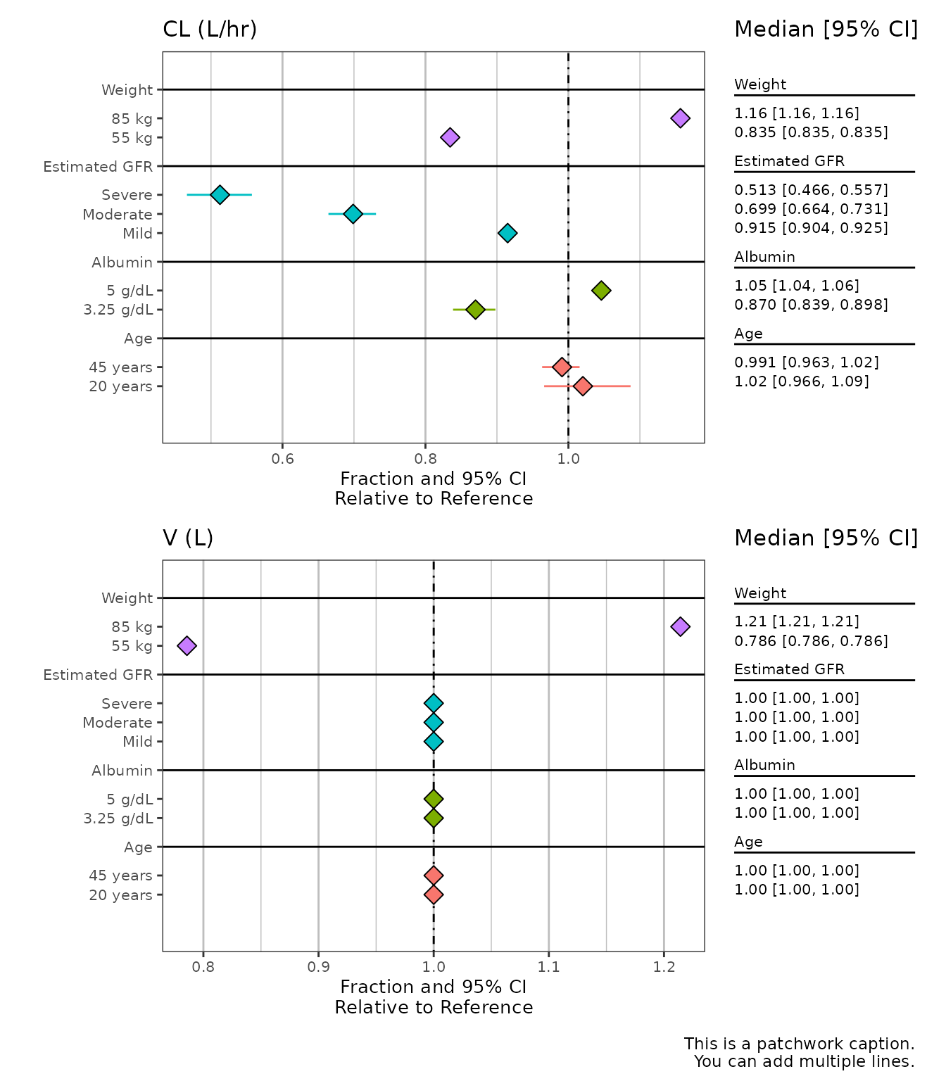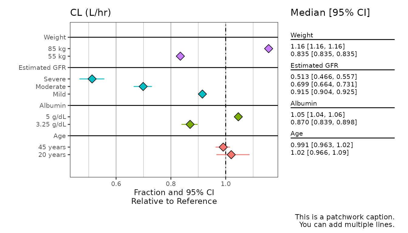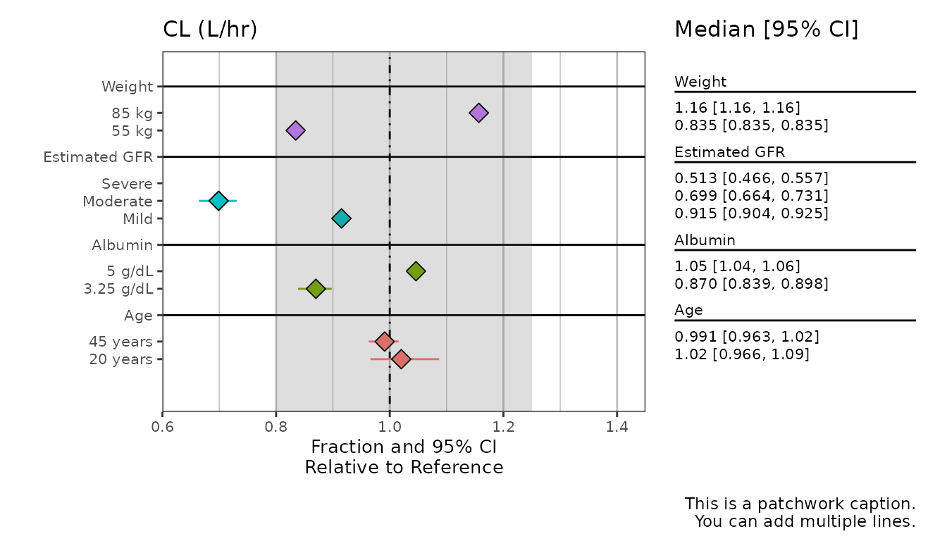 • The title at the top of the plot (“CL (L/hr)” in the example below) is pulled from the metagroup column of the data, as it is most useful when using metagroup to make multiple plots (shown later on). Here we just create it with dplyr::mutate() (and add a label for it to plot_labels).