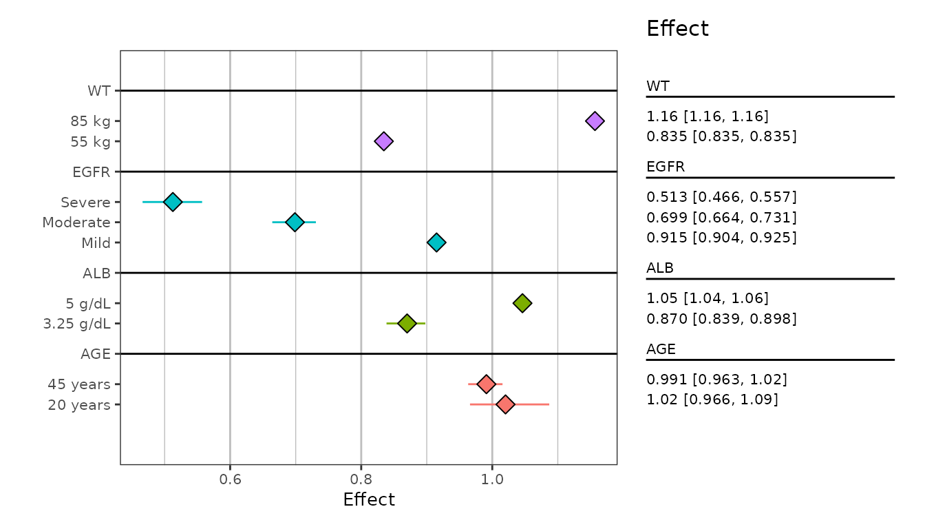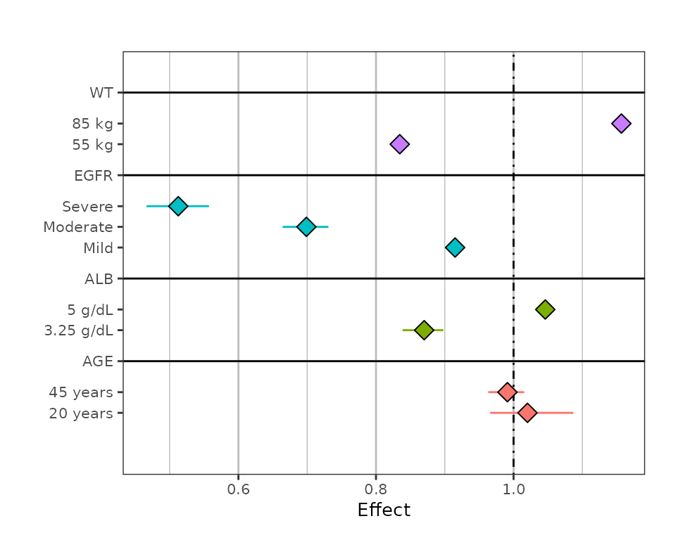 pmforest is a package for producing forest plots: graphical summaries of covariate effects or covariate-dependent predictions in a pharmacometric model.