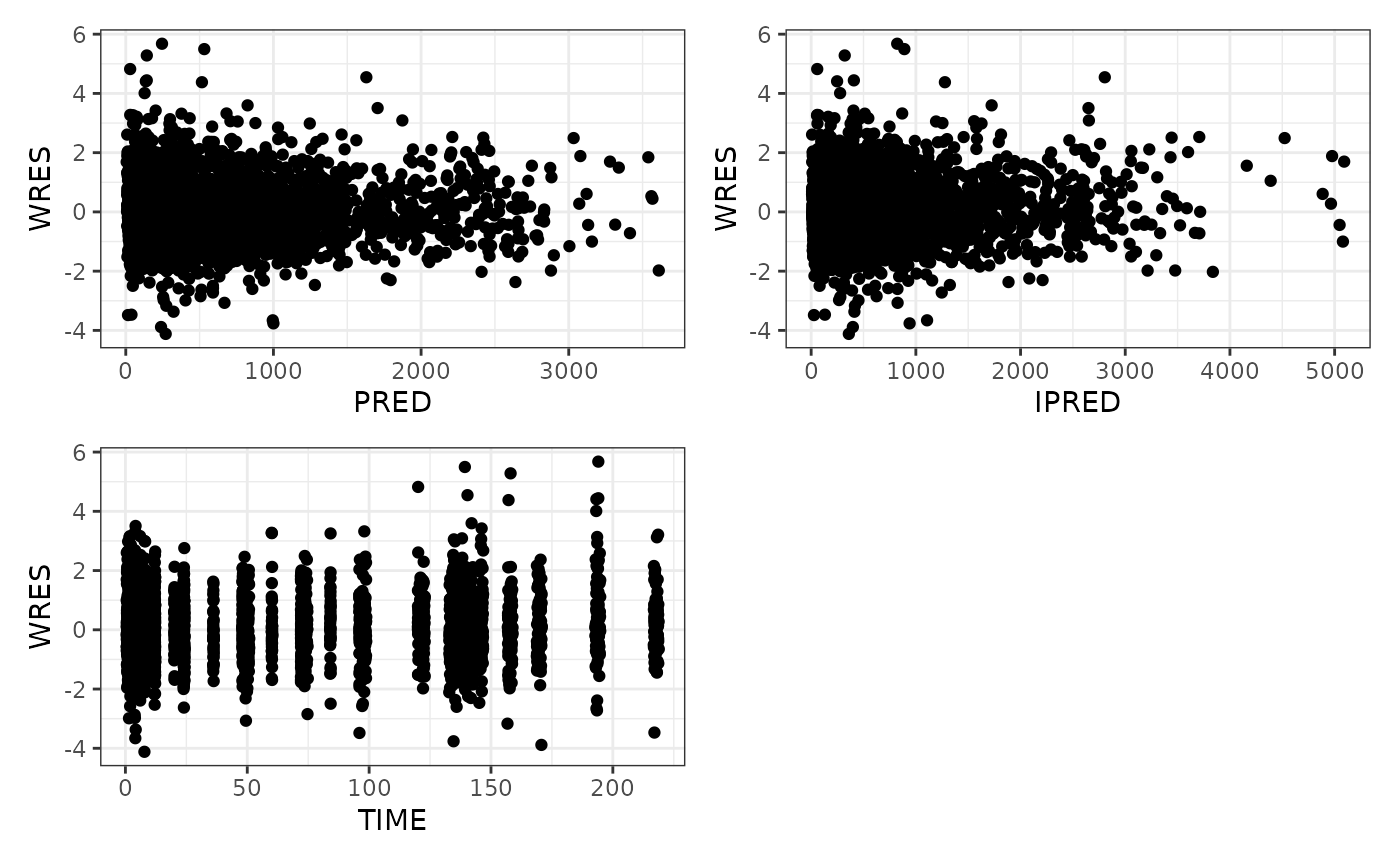 pm_scatter_list(data, y = "WRES", x = c("PRED", "IPRED", "TIME")) %>% pm_grid()