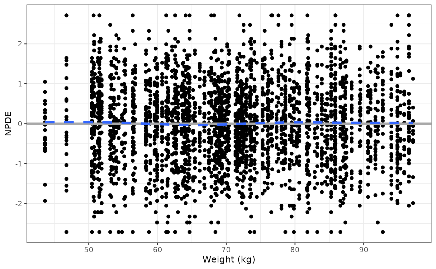 npde_cont(data, x= "WT//Weight (kg)")## `geom_smooth()` using formula = 'y ~ x'