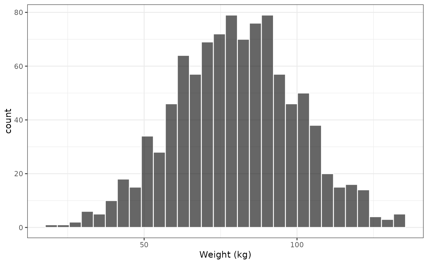 cont_hist(data, x = "WT//Weight (kg)")