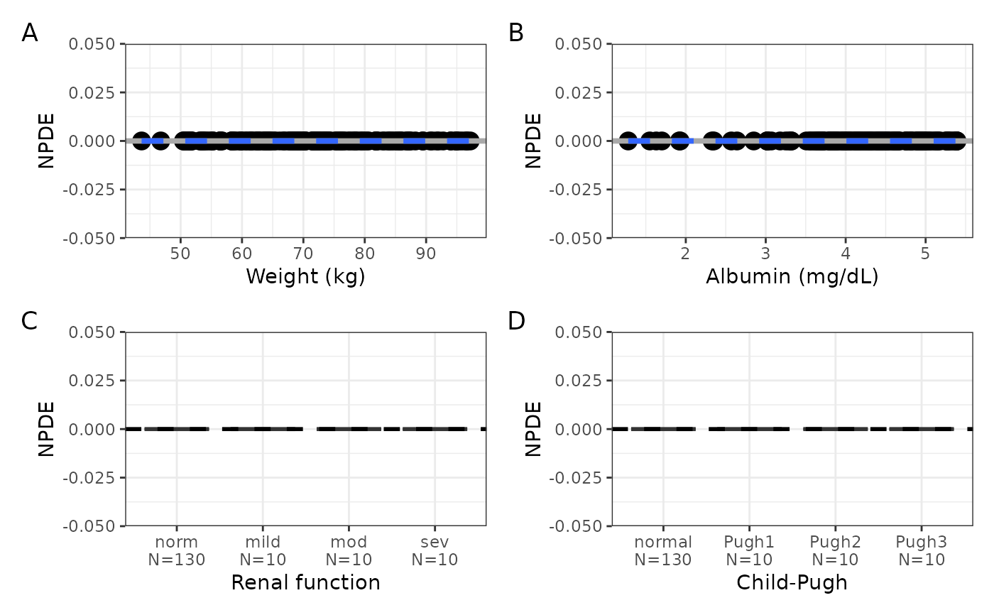 Get a single graphic of NPDE versus continuous and / or categorical covariates (npde_covariate()) or get a list that can be arranged by the user (npde_covariate_list()). See npde_panel() for other NPDE diagnostic displays.