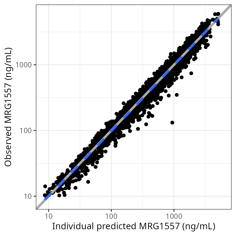 dv_pred_ipred(dd1, nrow = 3, ncol = 3, ylab = "Concentration (ng/mL)", log_y=TRUE). $`1`