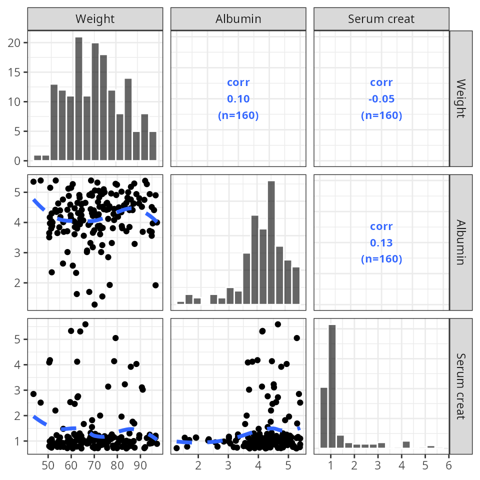 pairs_plot(id, c("WT//Weight", "ALB//Albumin", "SCR//Serum creat"))