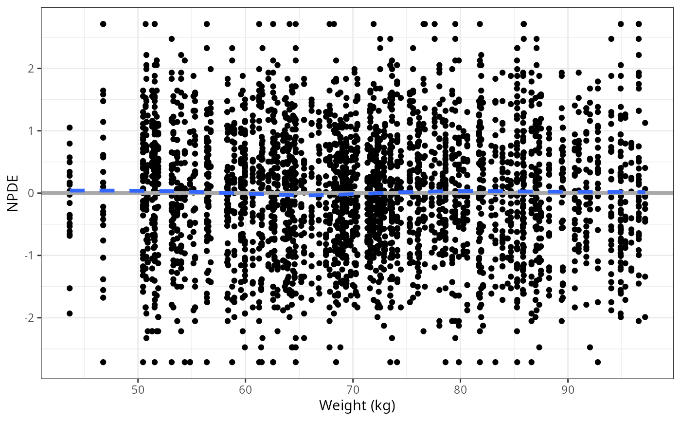 npde_cont(data, x= "WT//Weight (kg)")## `geom_smooth()` using formula = 'y ~ x'