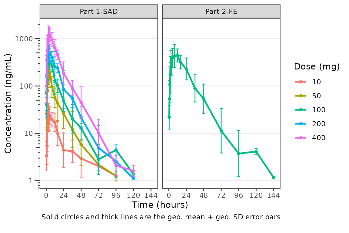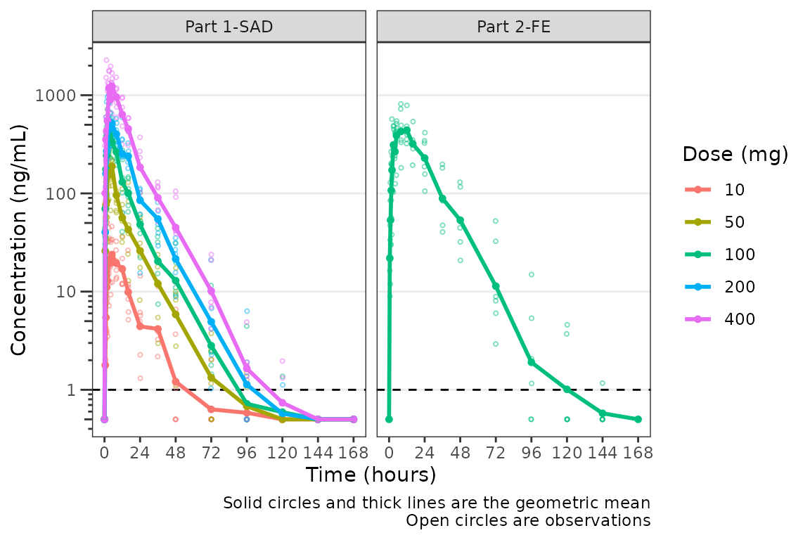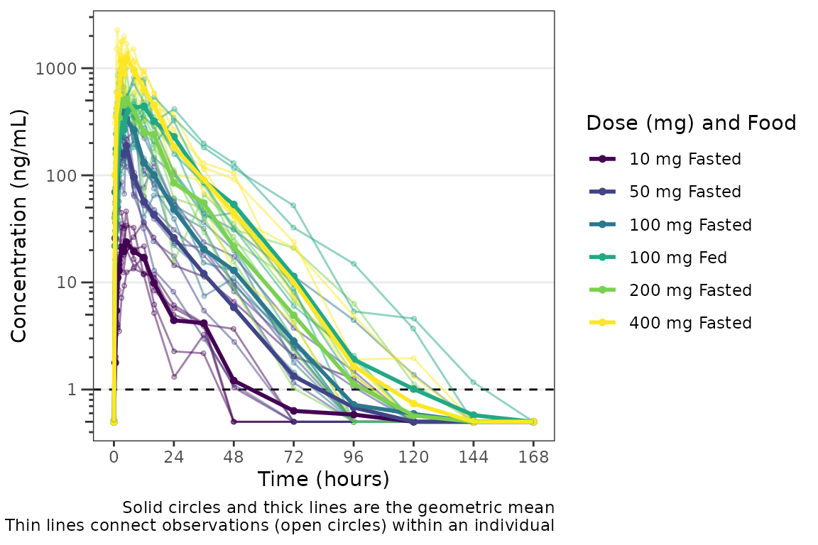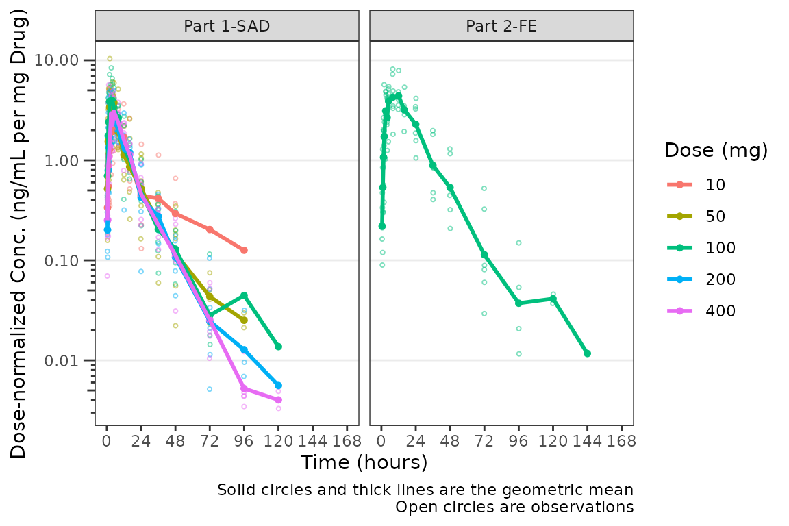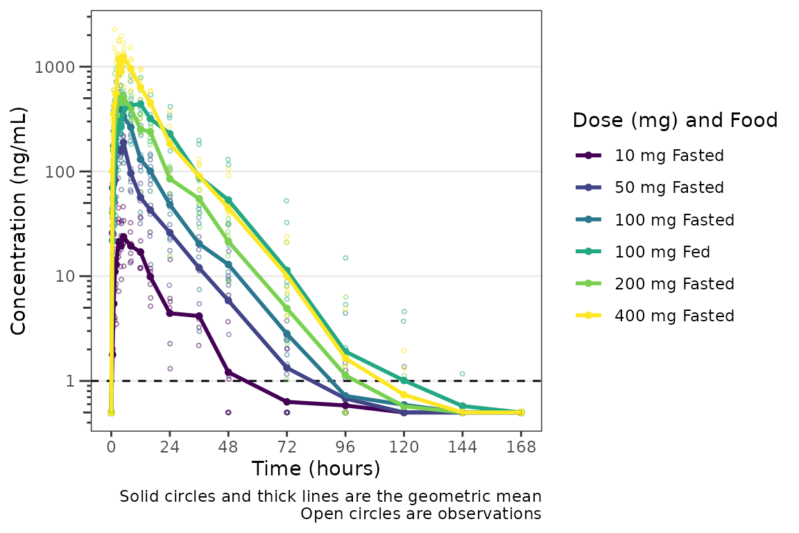 Not a bad plot with minimal arguments! We can see the mean for each dose as a colored thick line and observed data points as colored open circles with some alpha added. A caption also prints by default describing the plot elements.