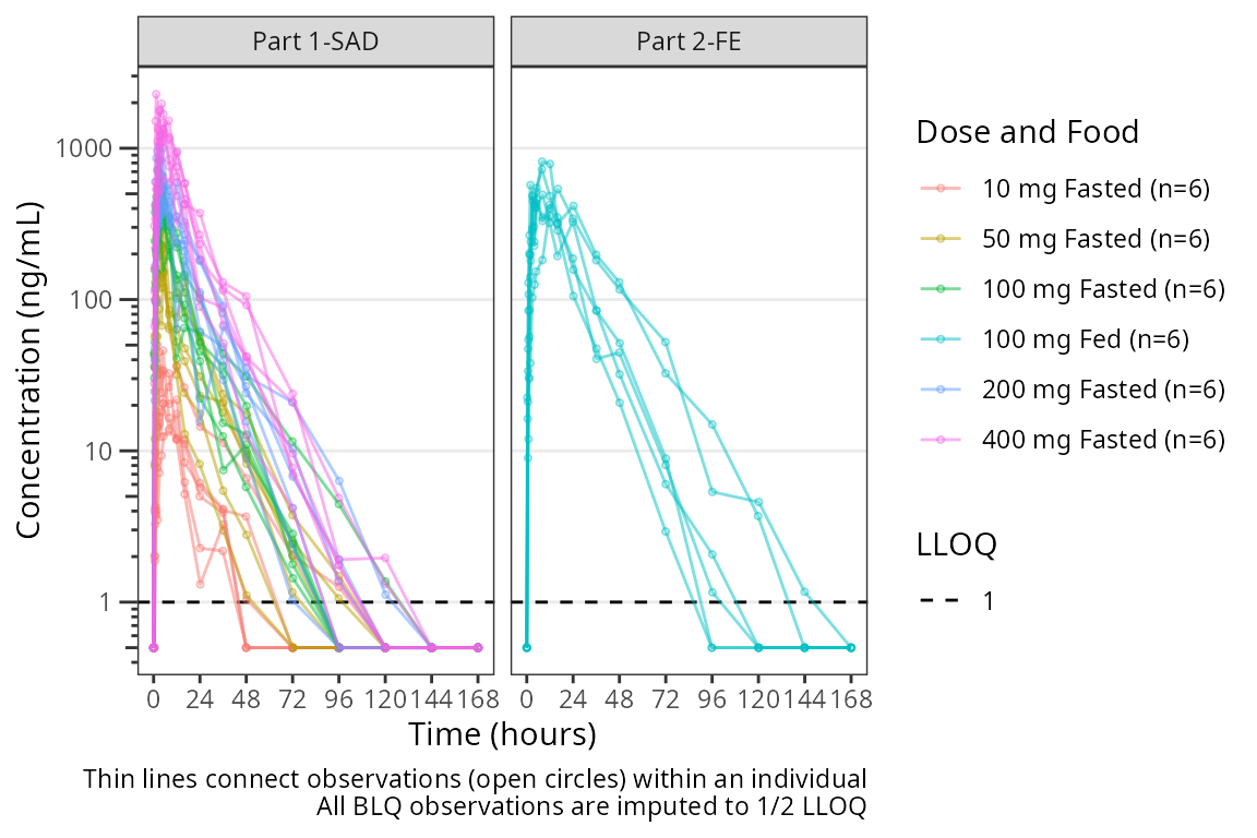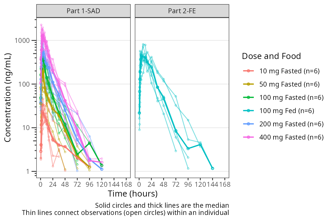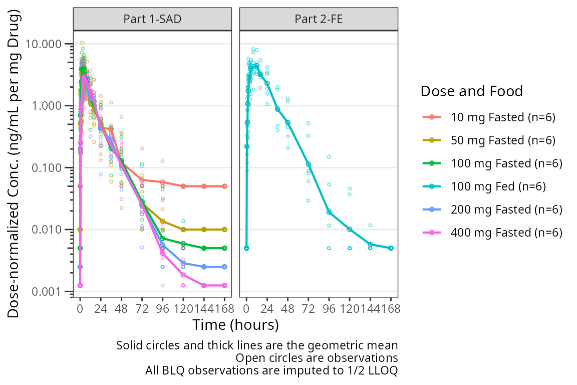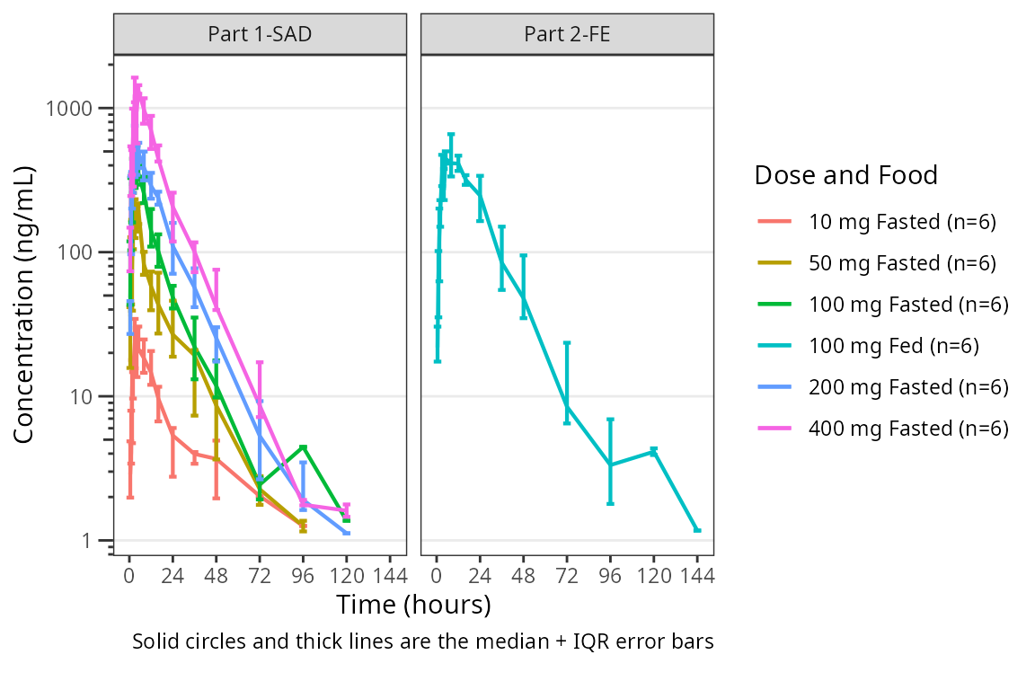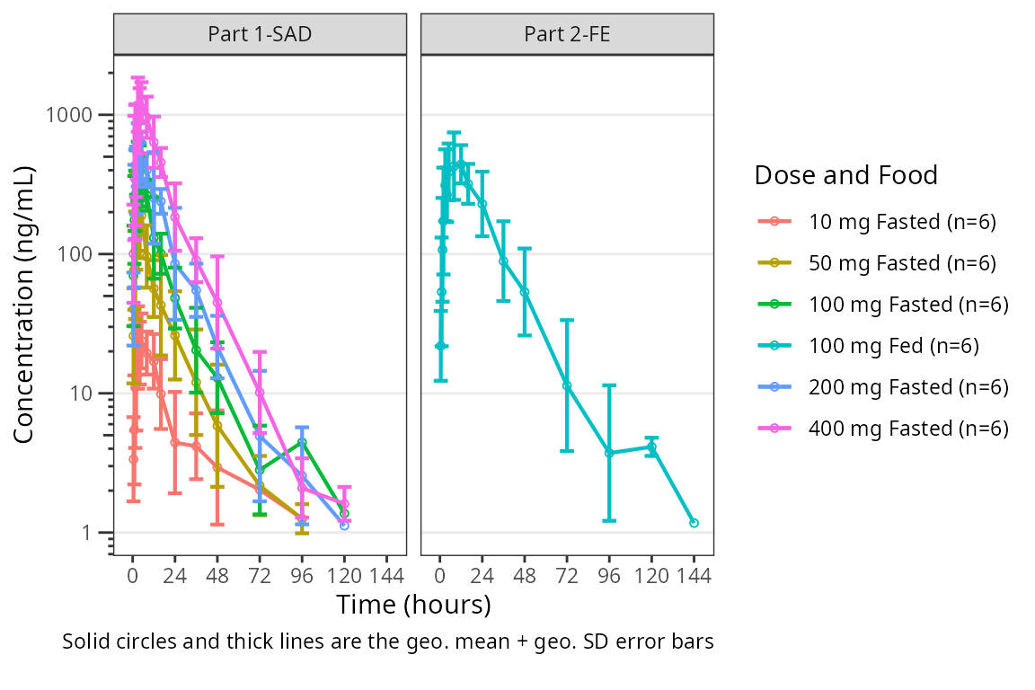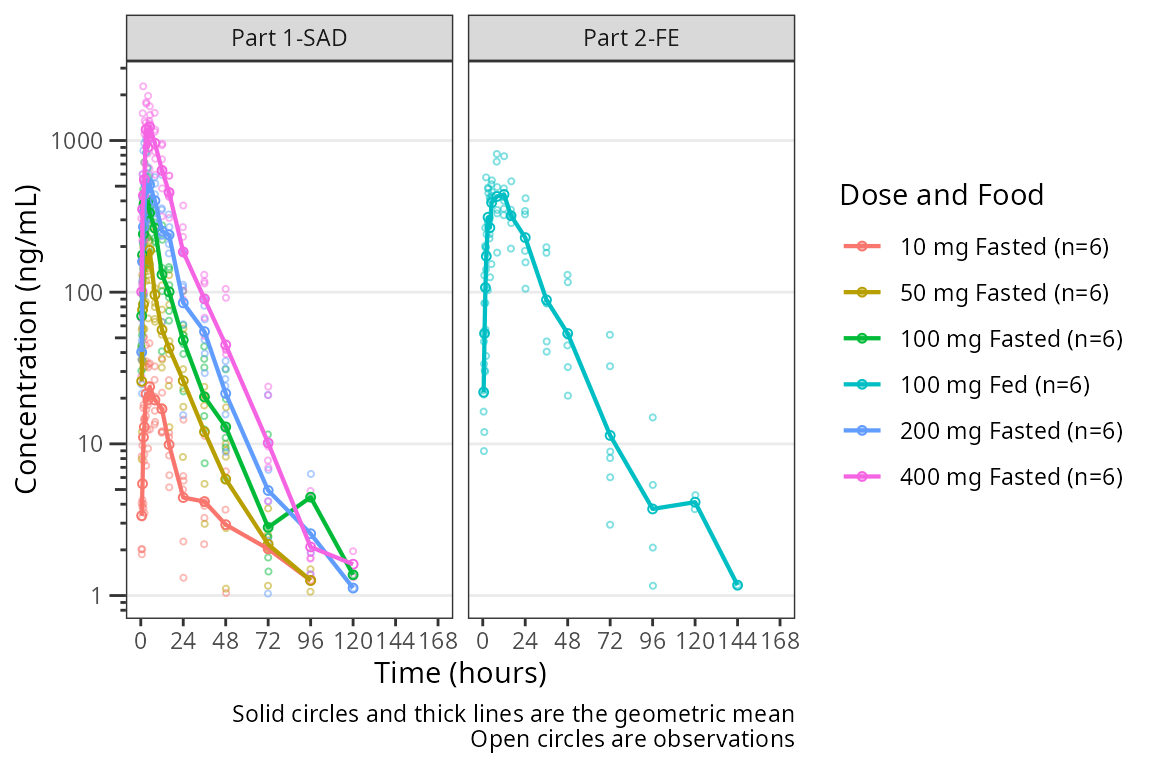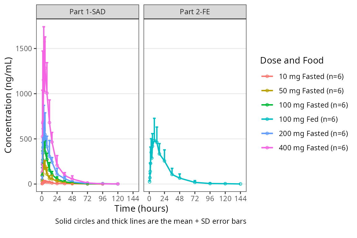 #> $ PART <chr> "Part 1-SAD", "Part 1-SAD", "Part 1-SAD", "Part 1-SAD", "Part …The study design consisted of two parts. Part 1 was a SAD study over a 10 to 400 mg dose range and Part 2 was a parallel 100 mg single dose food effect (FE) study.