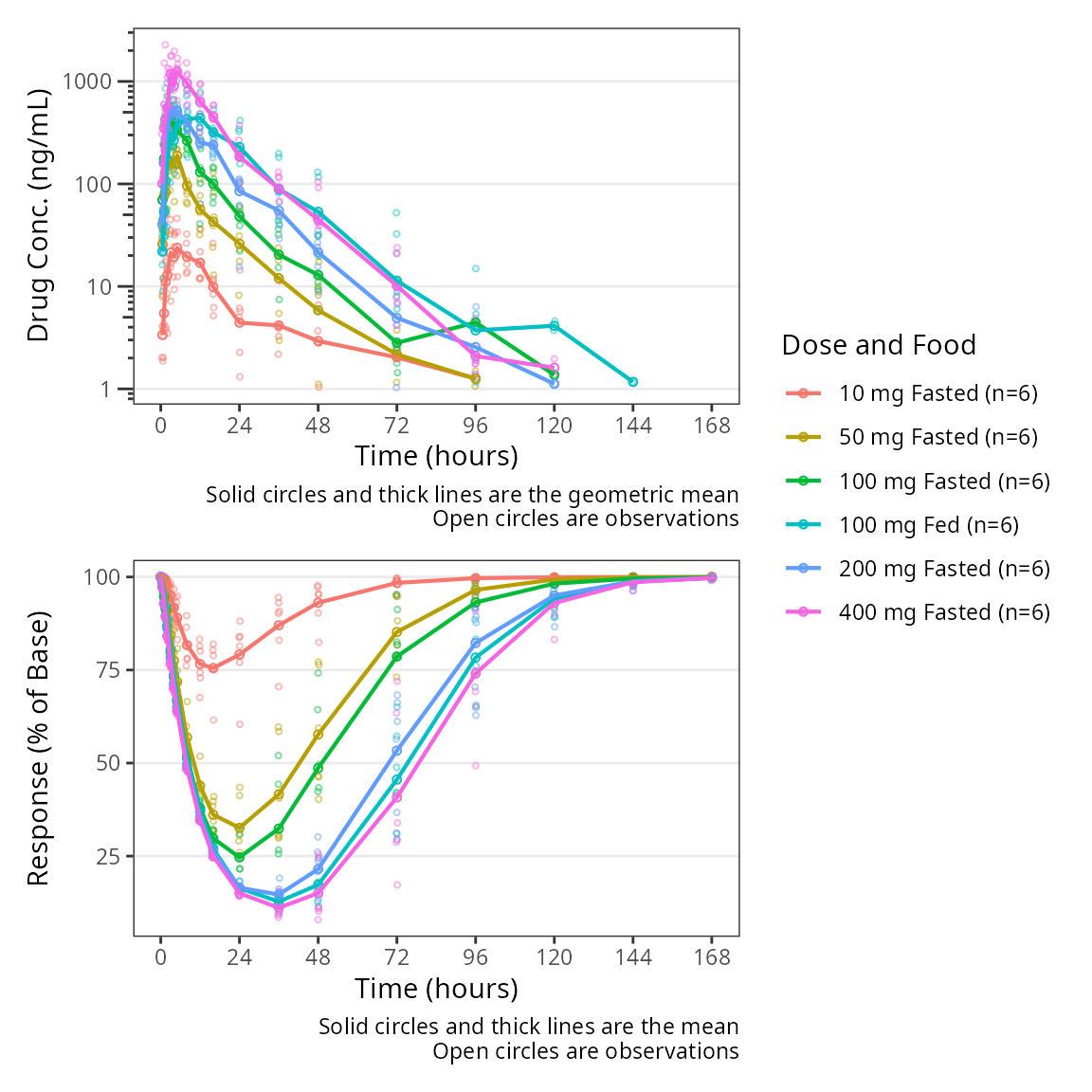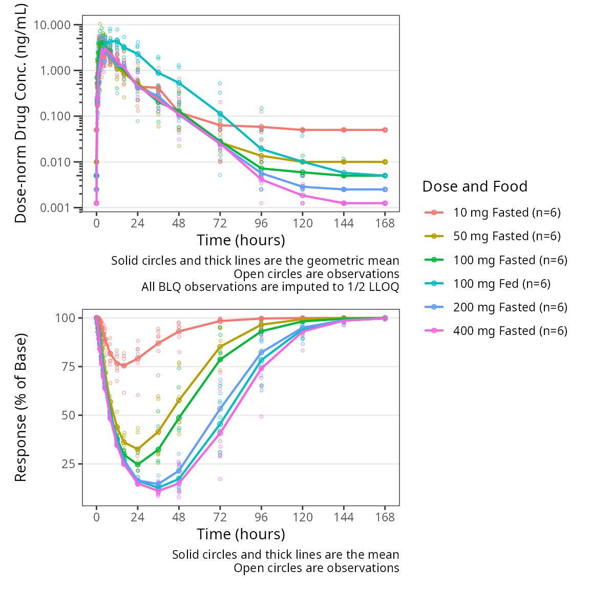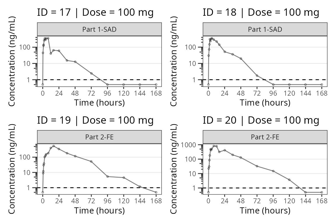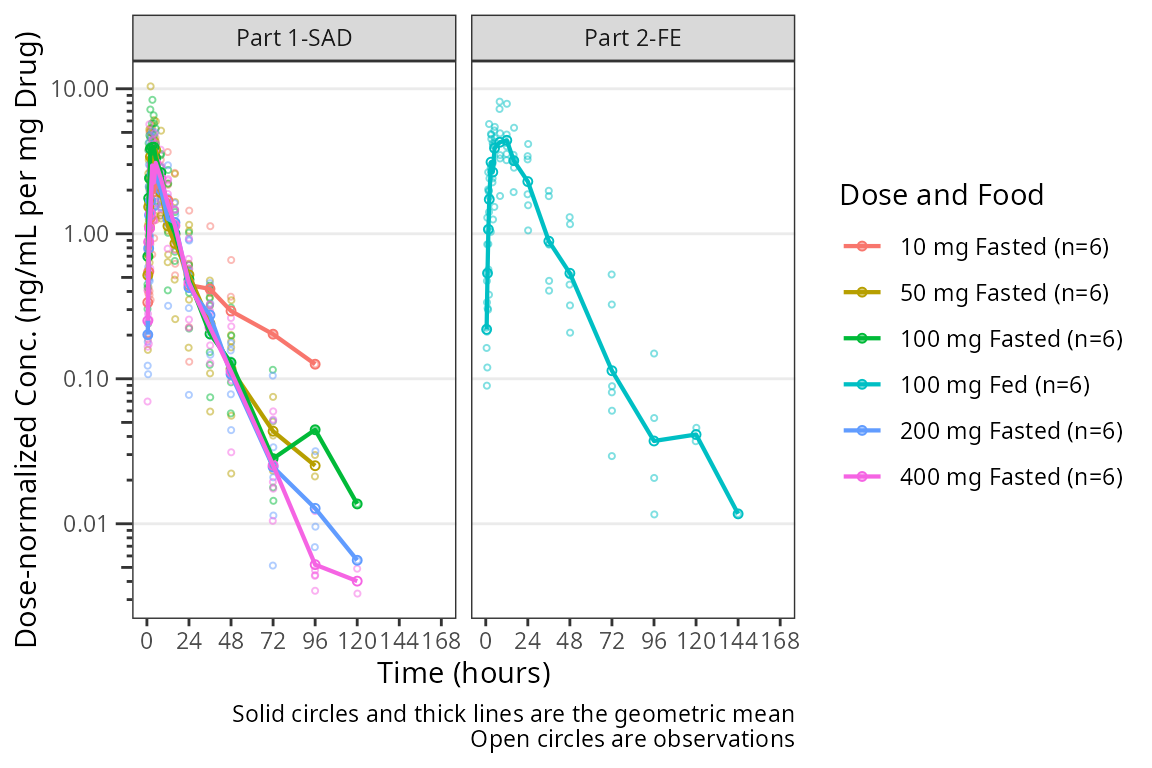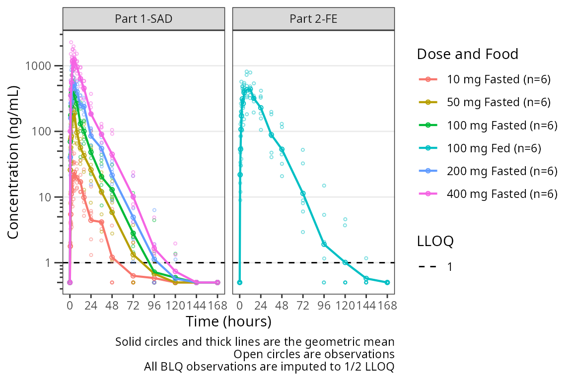 #> $ PART <chr> "Part 1-SAD", "Part 1-SAD", "Part 1-SAD", "Part 1-SAD", "Part …The study design consisted of two parts. Part 1 was a SAD study over a 10 to 400 mg dose range and Part 2 was a parallel 100 mg single dose food effect (FE) study.