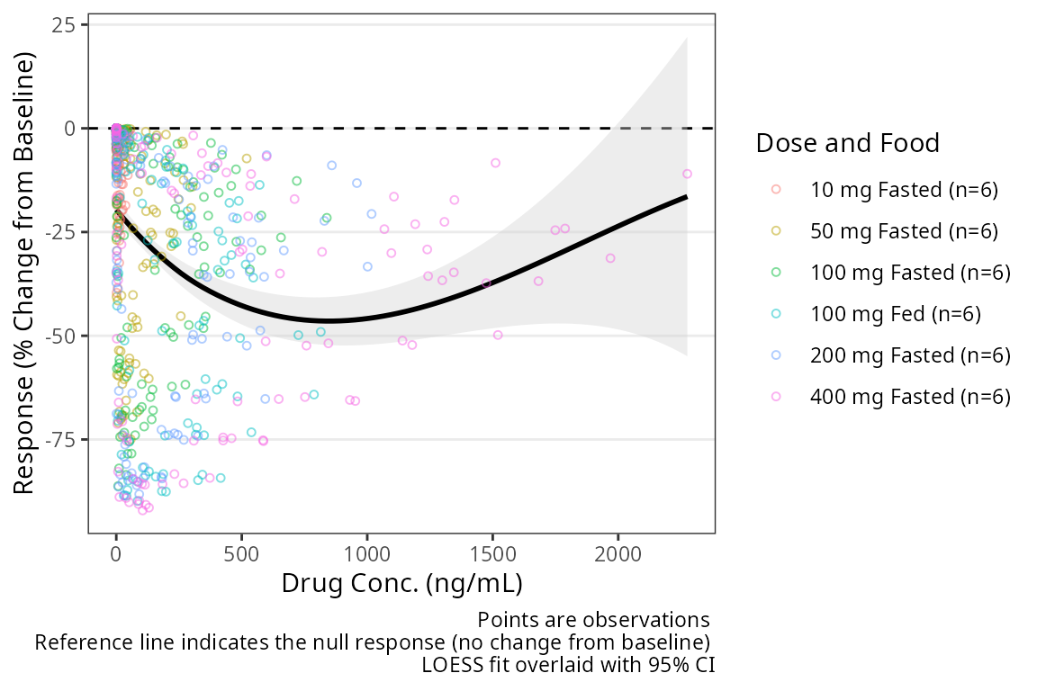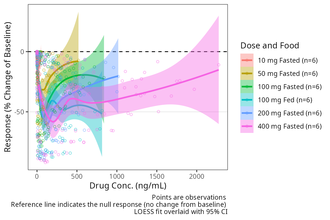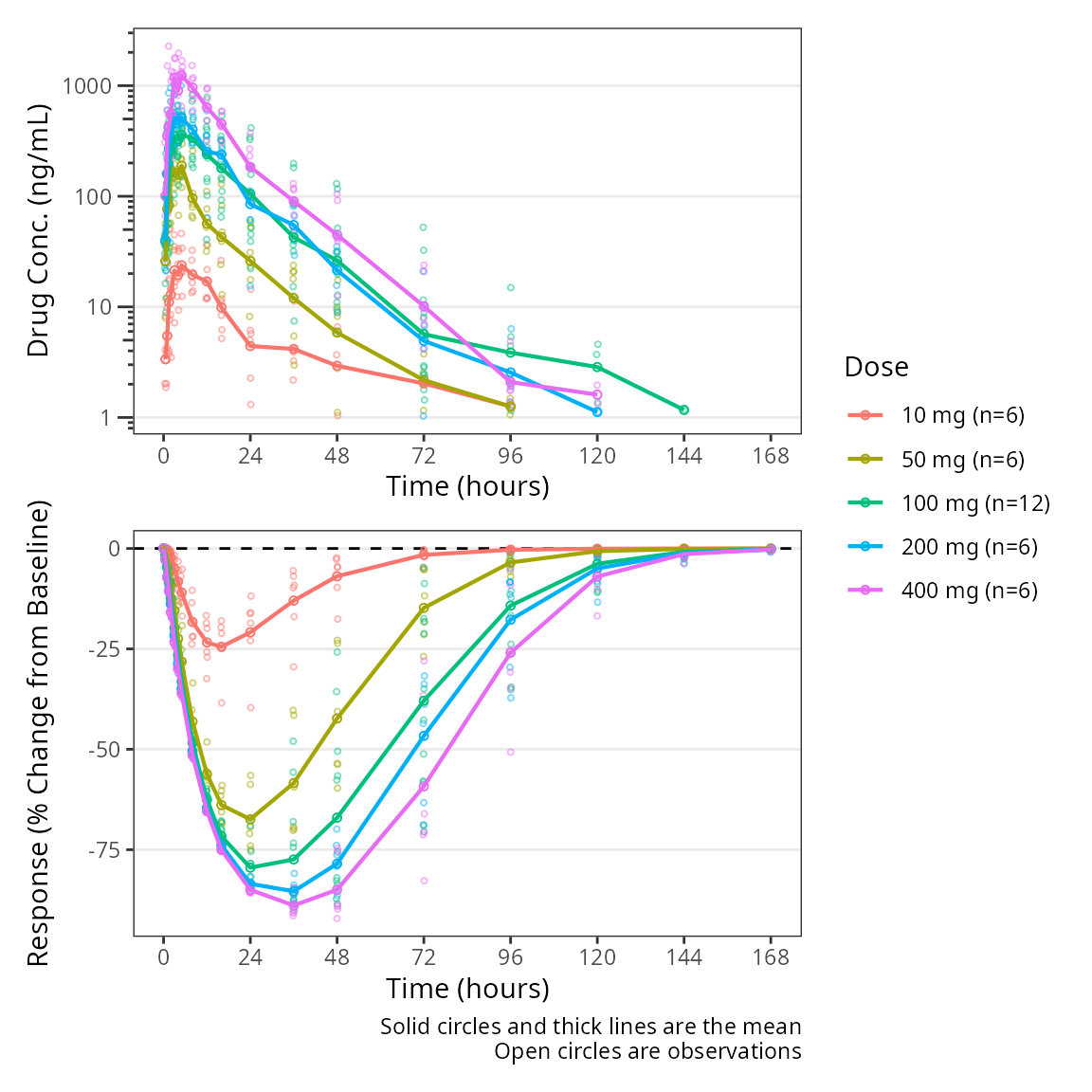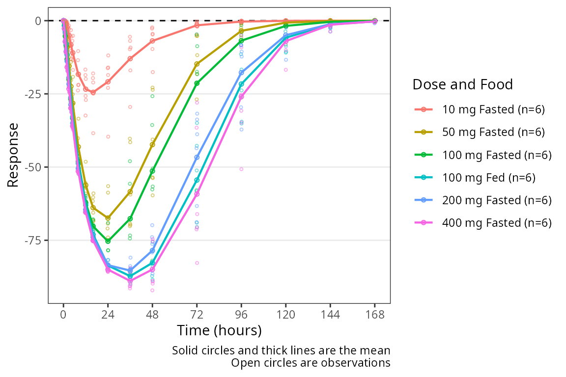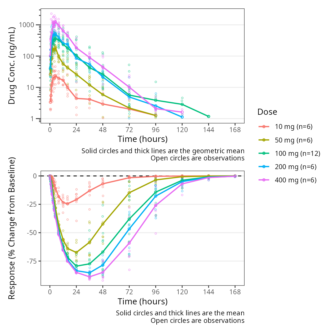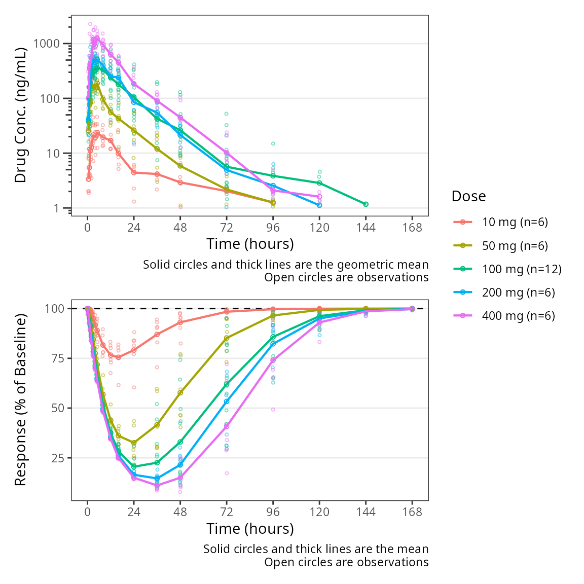 #> $ PART <chr> "Part 1-SAD", "Part 1-SAD", "Part 1-SAD", "Part 1-SAD", "Part …The study design consisted of two parts. Part 1 was a SAD study over a 10 to 400 mg dose range and Part 2 was a parallel 100 mg single dose food effect (FE) study.