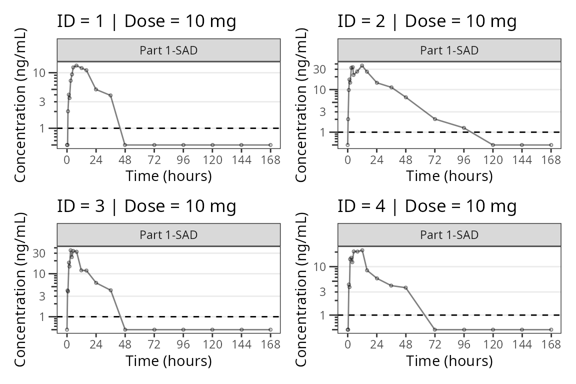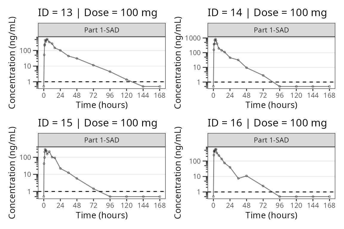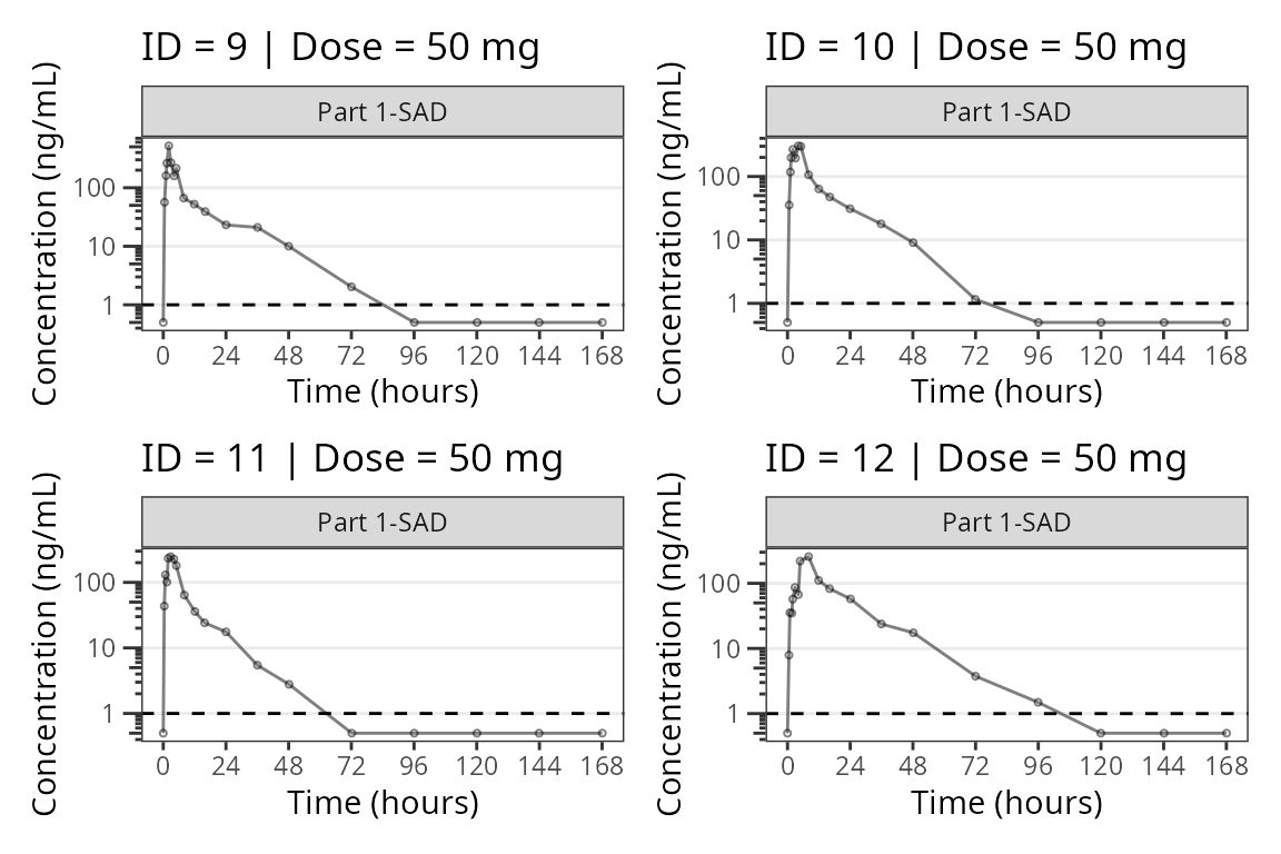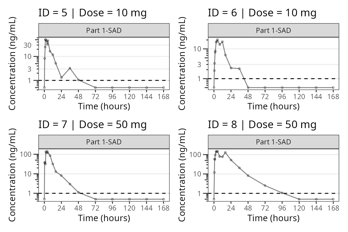 conc_obj <- PKNCAconc(filter(data_sad_nca_input, EVID==0), CONC~TIME|ID+DOSE+PART)