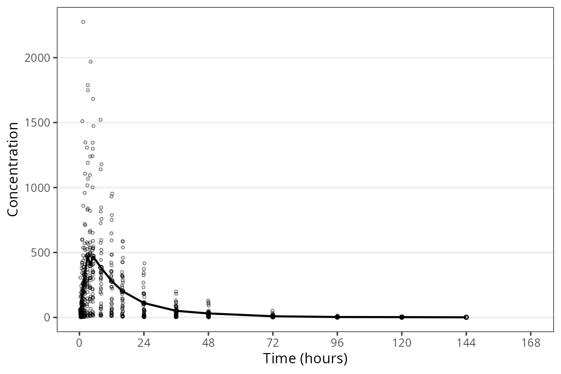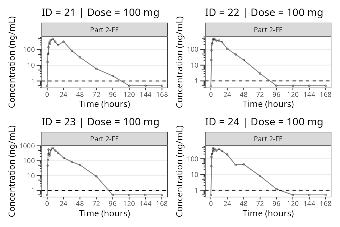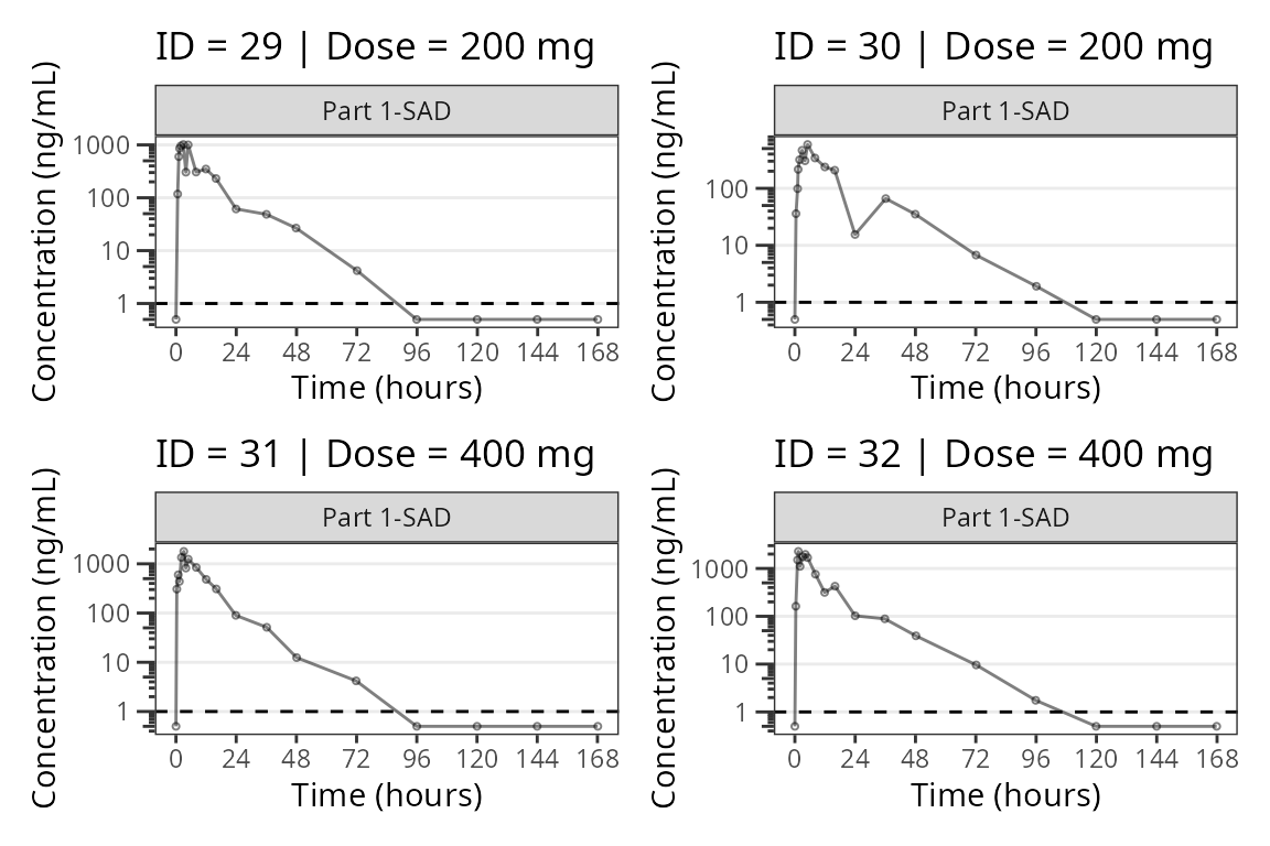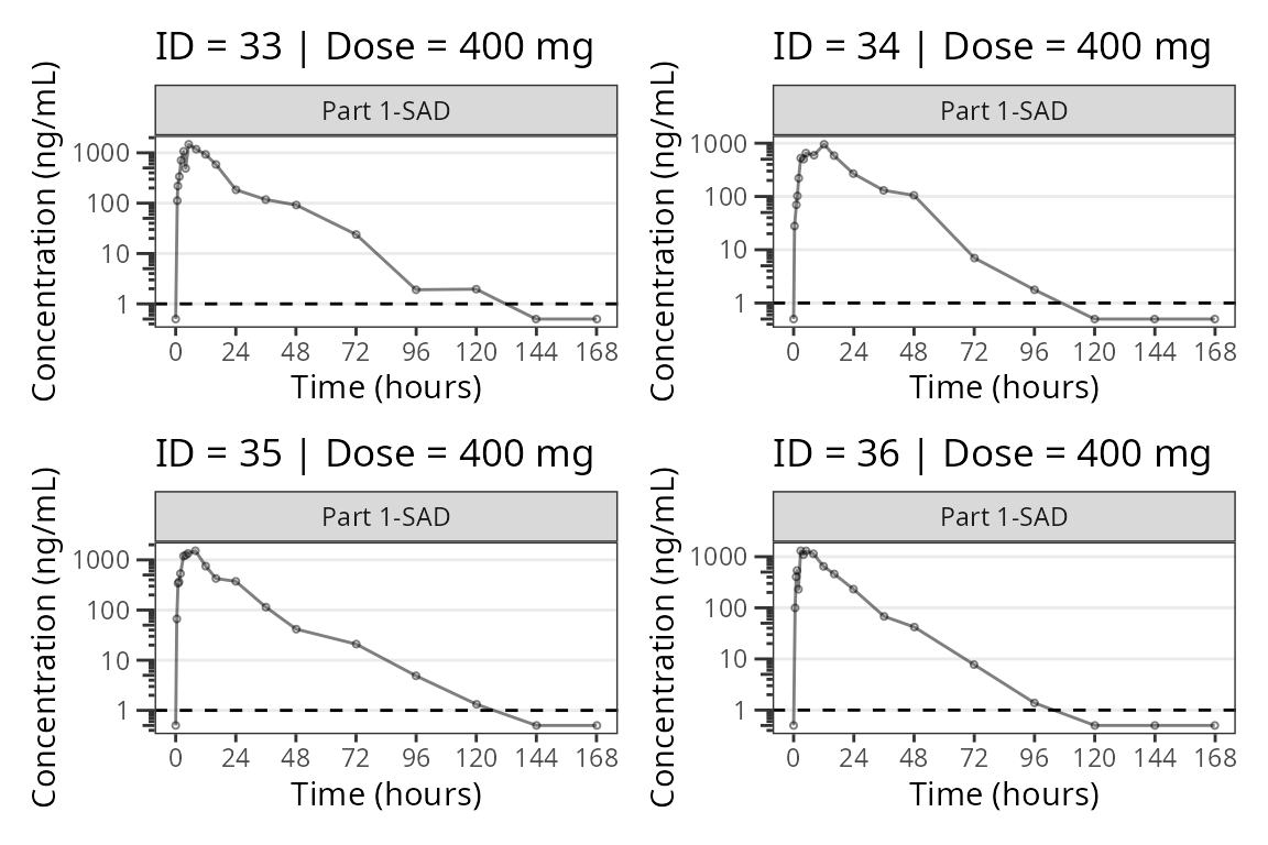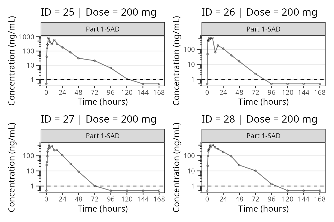 conc_obj <- PKNCAconc(filter(data_sad_nca_input, EVID==0), CONC~TIME|ID+DOSE+PART)