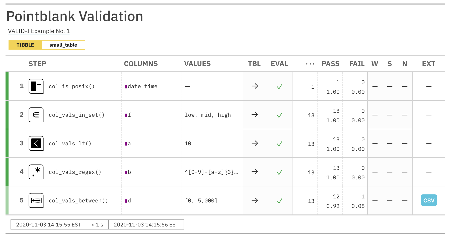 [2] "WARN [2020-11-06 01:26:07] Step 3 exceeded the WARN failure threshold (f_failed = 0.15385) ['col_vals_lt']"