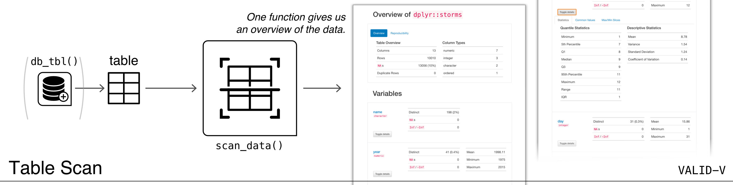 - Variables: Provides a summary for each table variable and further statistics and summaries depending on the variable type