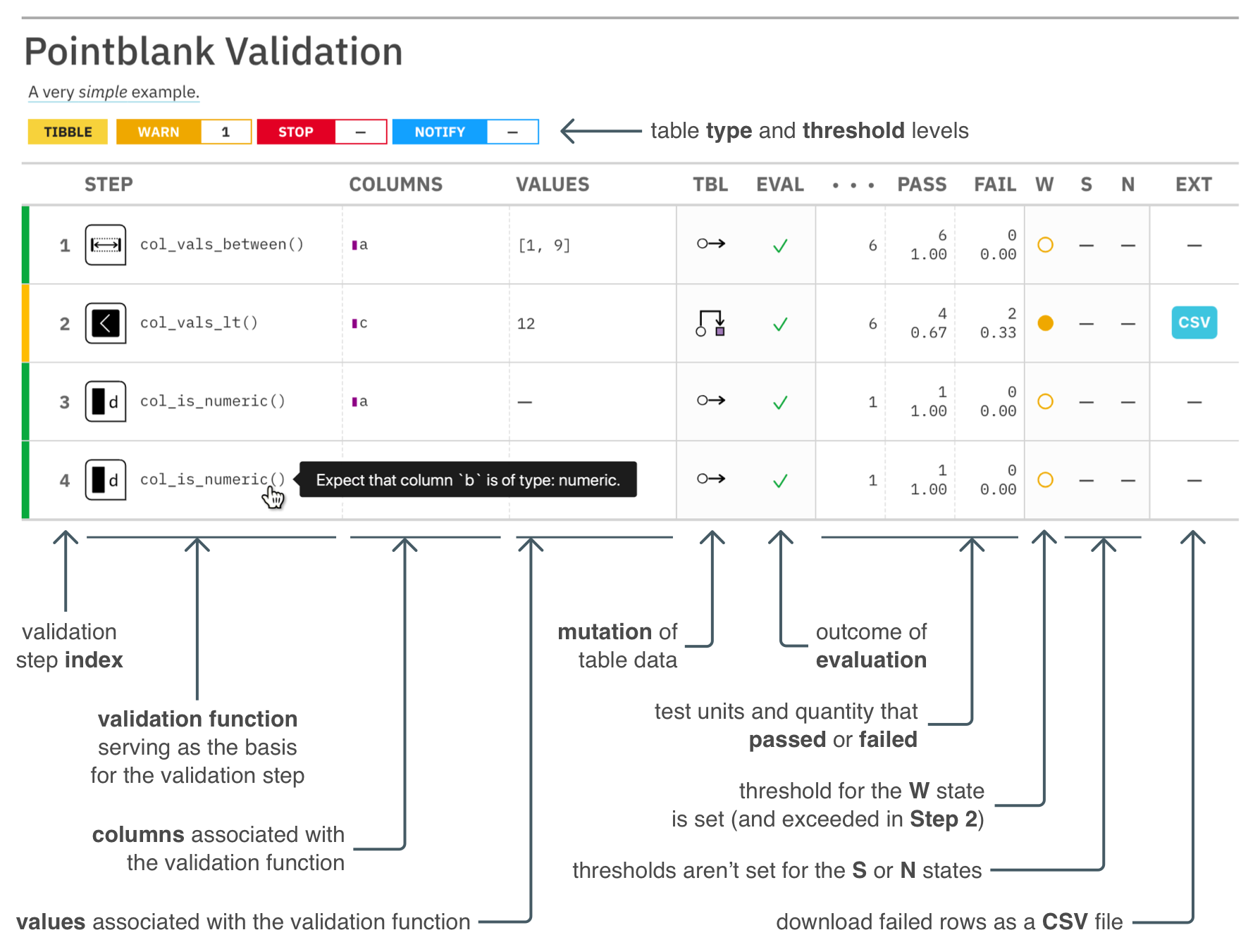 col_is_numeric(columns = c(a, b))Error: Exceedance of failed test units where values in `c` should have been < `12`.