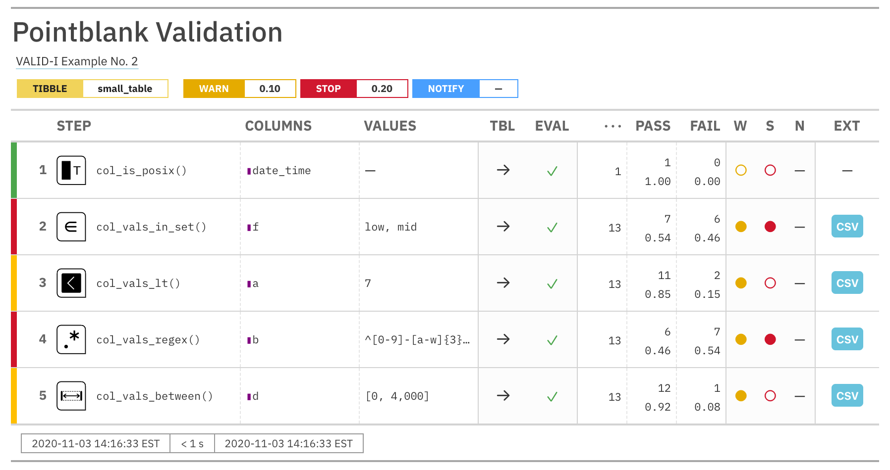 [2] "WARN [2020-11-06 01:26:07] Step 3 exceeded the WARN failure threshold (f_failed = 0.15385) ['col_vals_lt']"