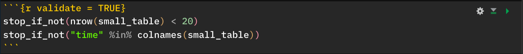 It’s worth reminding at this point that failed validations do not stop execution of the R Markdown rendering. Otherwise you wouldn’t see a document with any failing validations, and, you wouldn’t know where those failed validations occurred. The expectation for this workflow is to add in the relevant validation expressions at key junctures and should any failures occur, one can fix the underlying issues until all (or enough) validations pass.