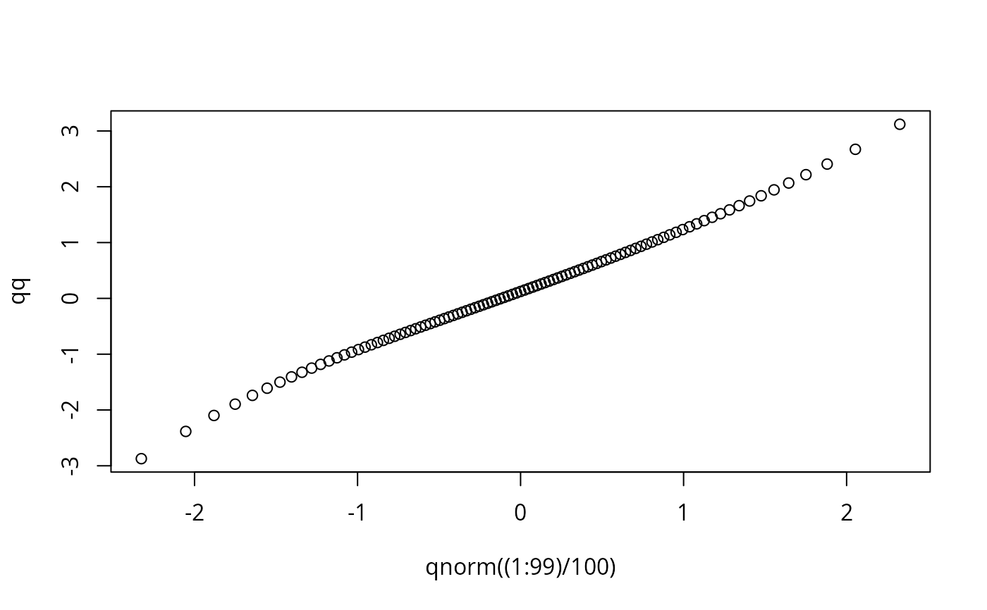 plot(qnorm((1:99)/100), qq) # qq plot of the fitted density