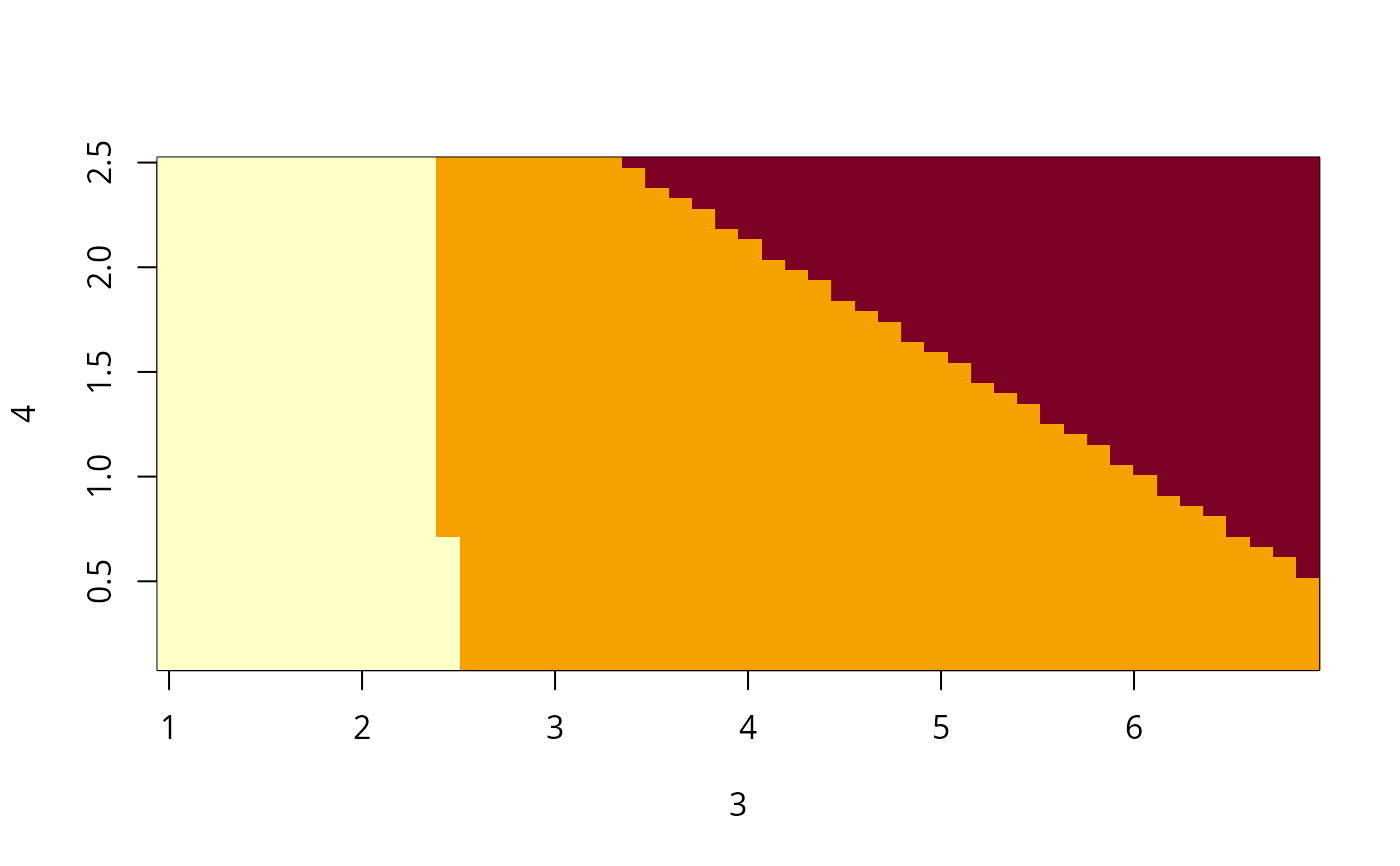 Plots the probability of one class as an image plot of two variables.
