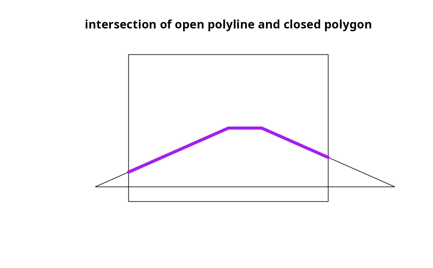 xlab="", ylab="", main="intersection of open polyline and closed polygon")