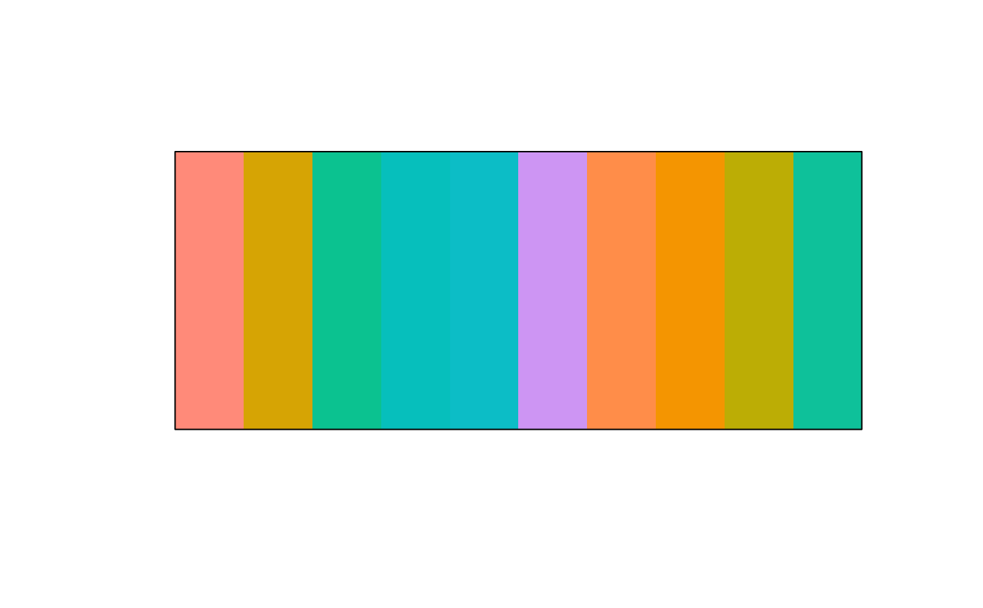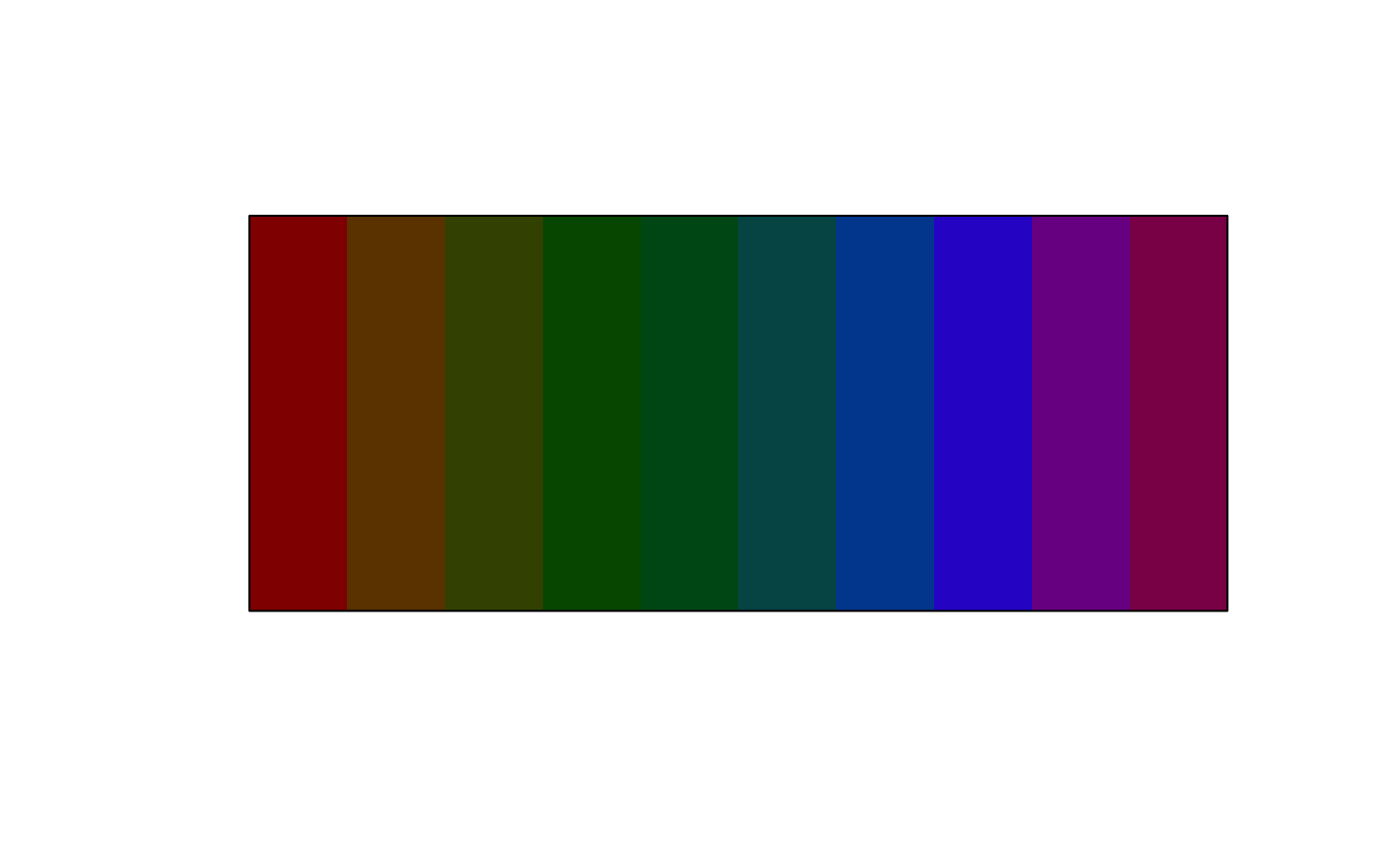 modify_hcl(col, h, c, l)a color object or vector of any of the three kinds of R color specifications, i.e., either a color name (as listed by colors()), a hexadecimal string of the form "#rrggbb" or "#rrggbbaa" (see rgb), or a positive integer i meaning palette()[i].