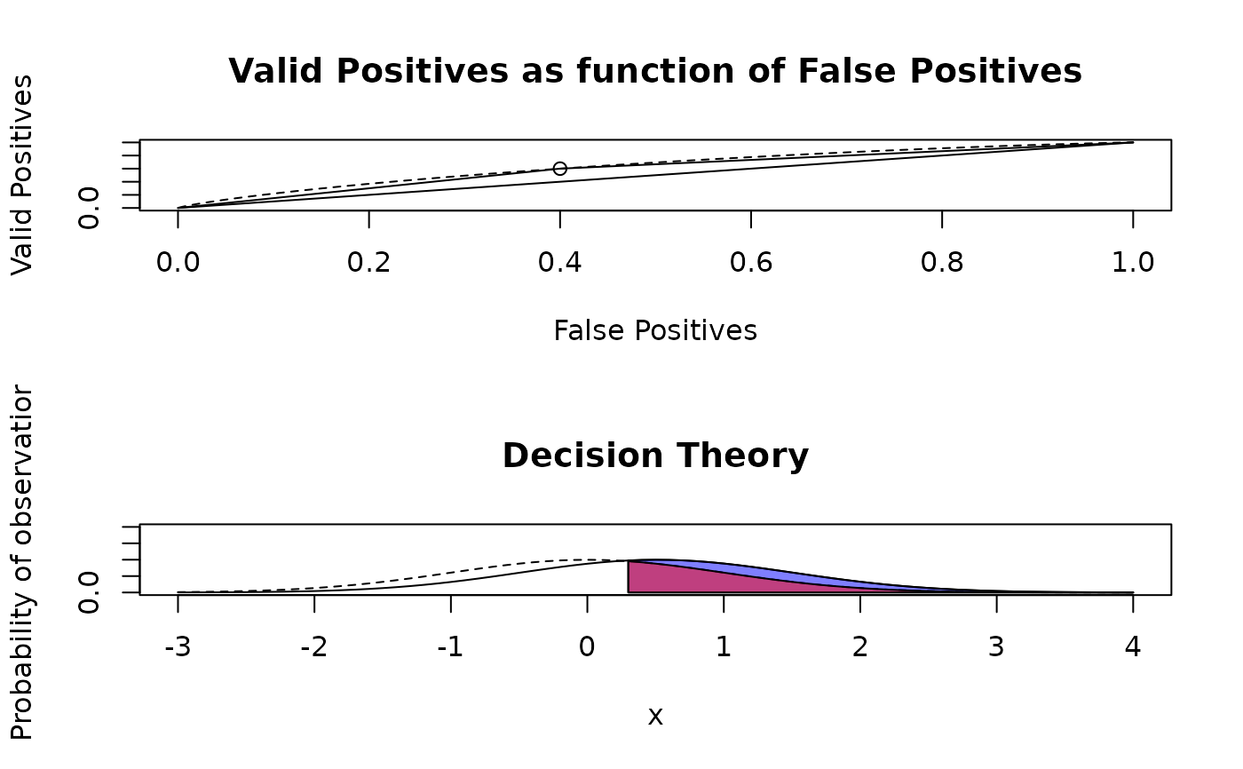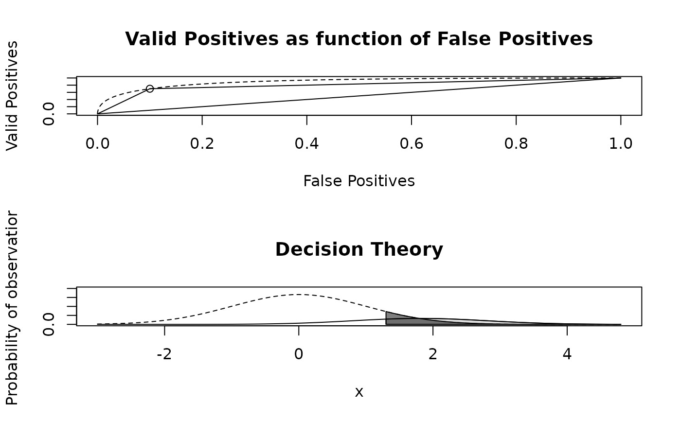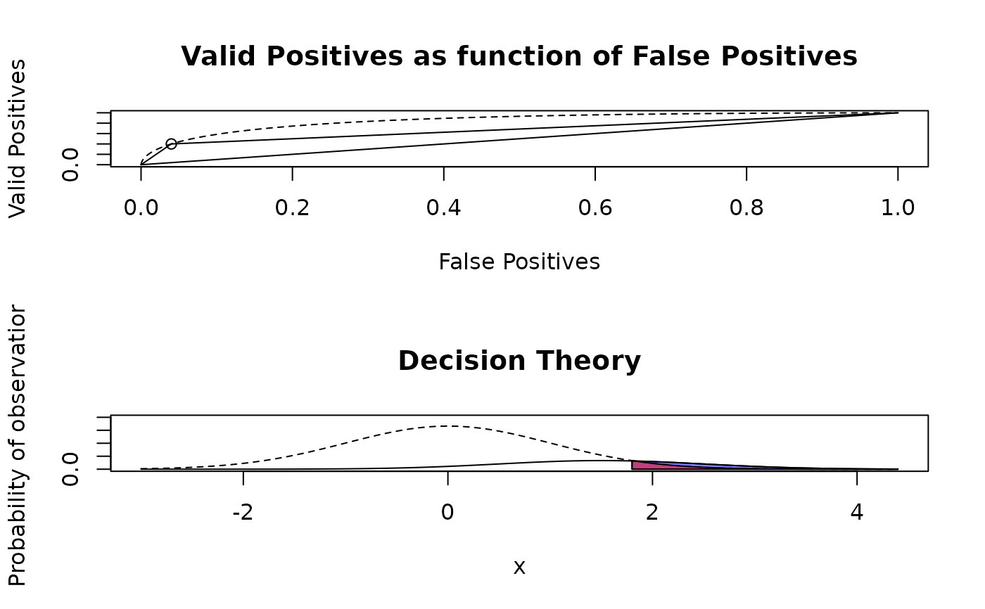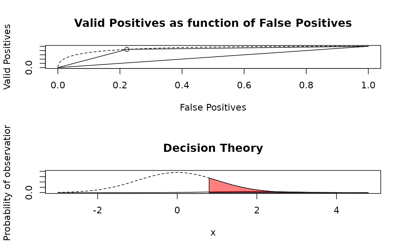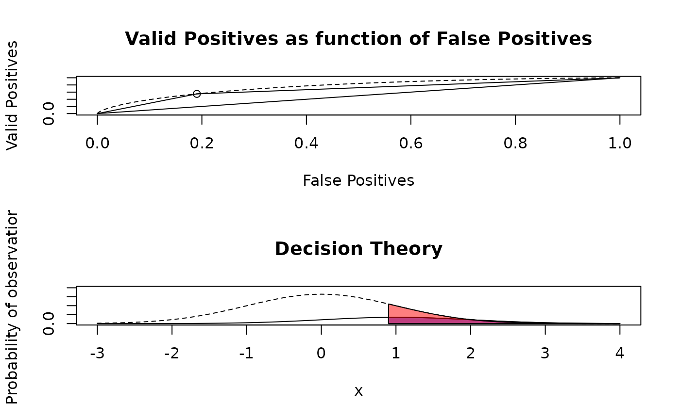 Although only one point is found, we can form a graphical display of VP versus FP as a smooth curve as a function of the decision criterion. The smooth curve assumes normality whereas the other merely are the two line segments between the points (0,0), (FP,VP), (1,1). The resulting correlation between the inferred continuous state of the world and the dichotomous decision process is a biserial correlation.
