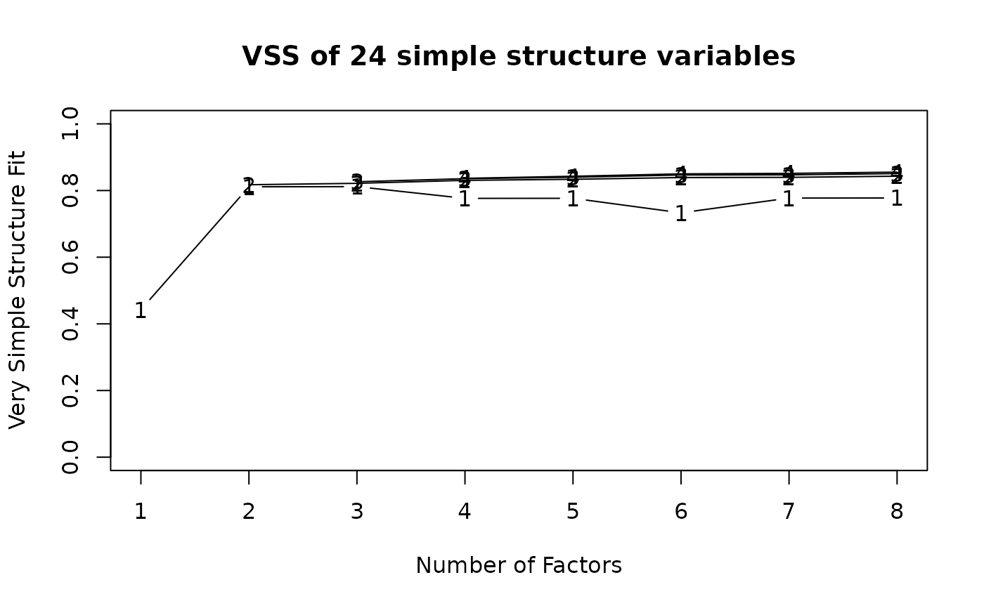 #> Very Simple Structure of VSS of 24 simple structure variables