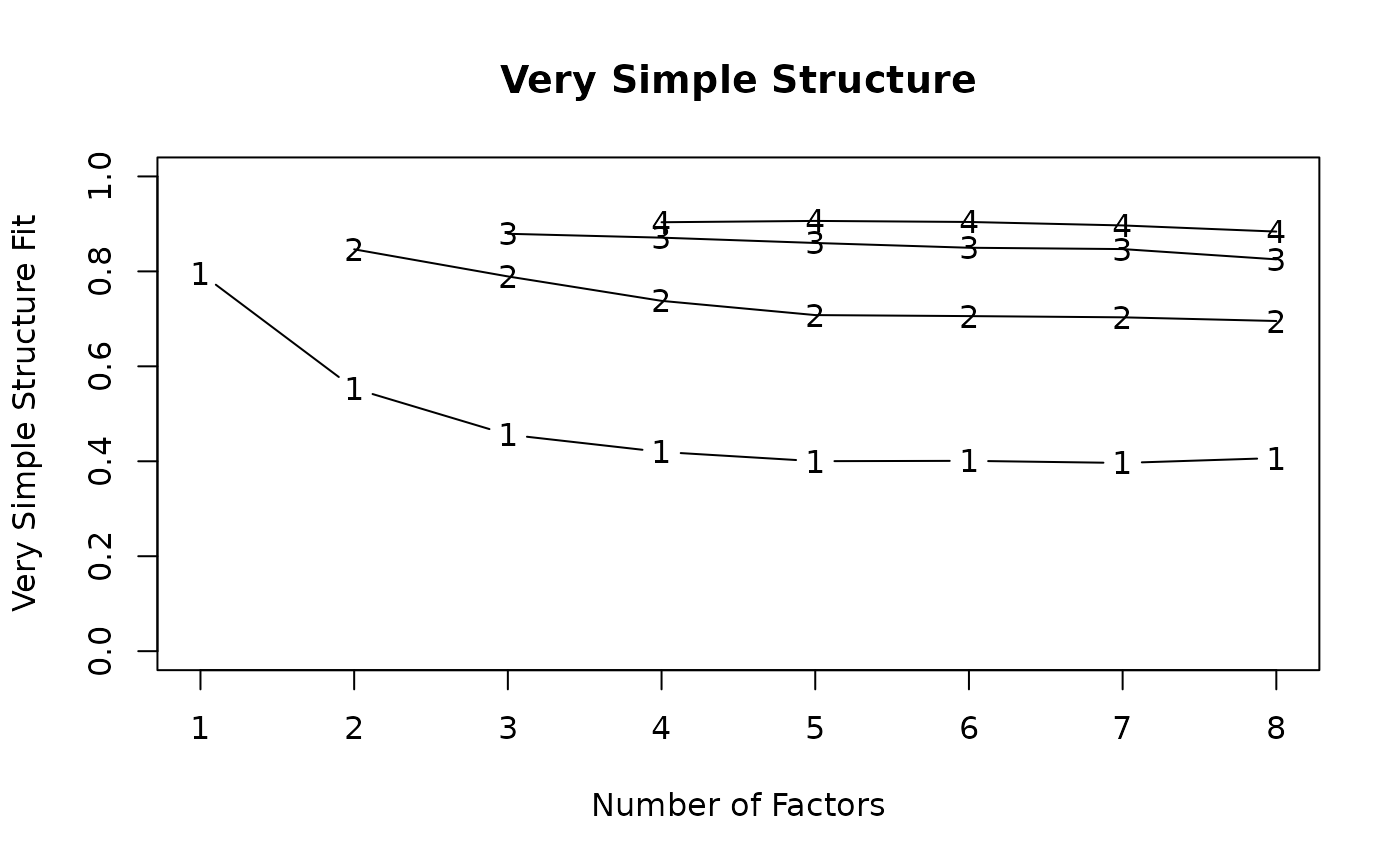 The Very Simple Structure criterion will tend to peak at the number of factors that are most interpretable for a given level of complexity. Note that some problems, the most interpretable number of factors will differ as a function of complexity. For instance, when doing the Harman 24 psychological variable problems, an unrotated solution of complexity one suggests one factor (g), while a complexity two solution suggests that a four factor solution is most appropriate. This latter probably reflects a bi-factor structure.