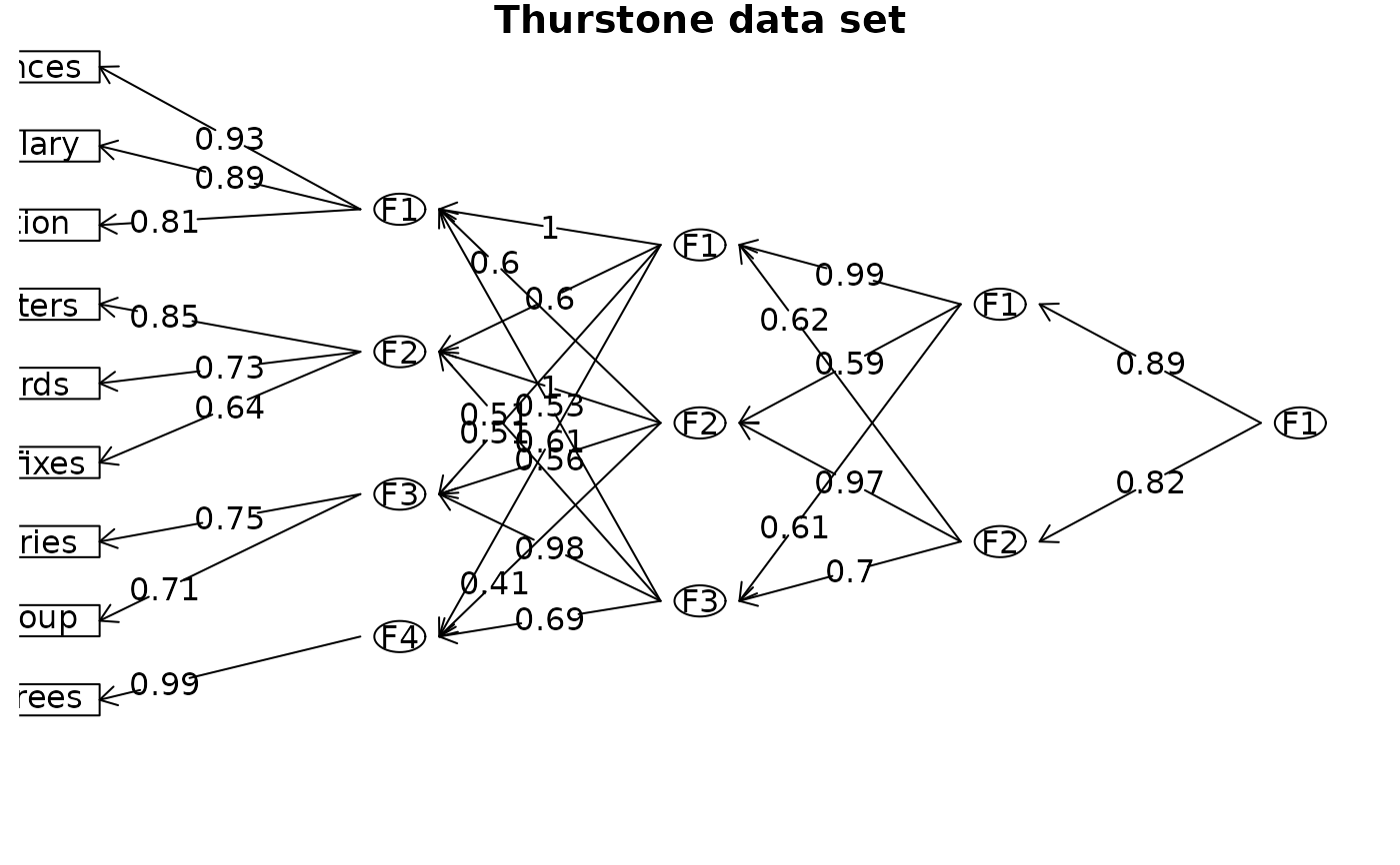 bassAckward(Thurstone,4,main="Thurstone data set")