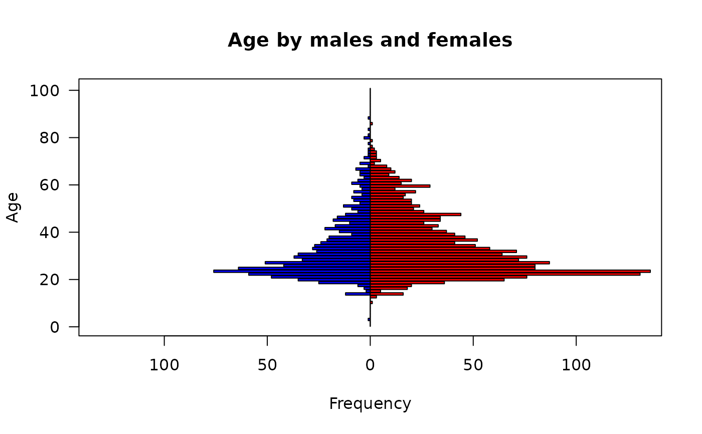 bi.bars(bfi,"age","gender" ,ylab="Age",main="Age by males and females")